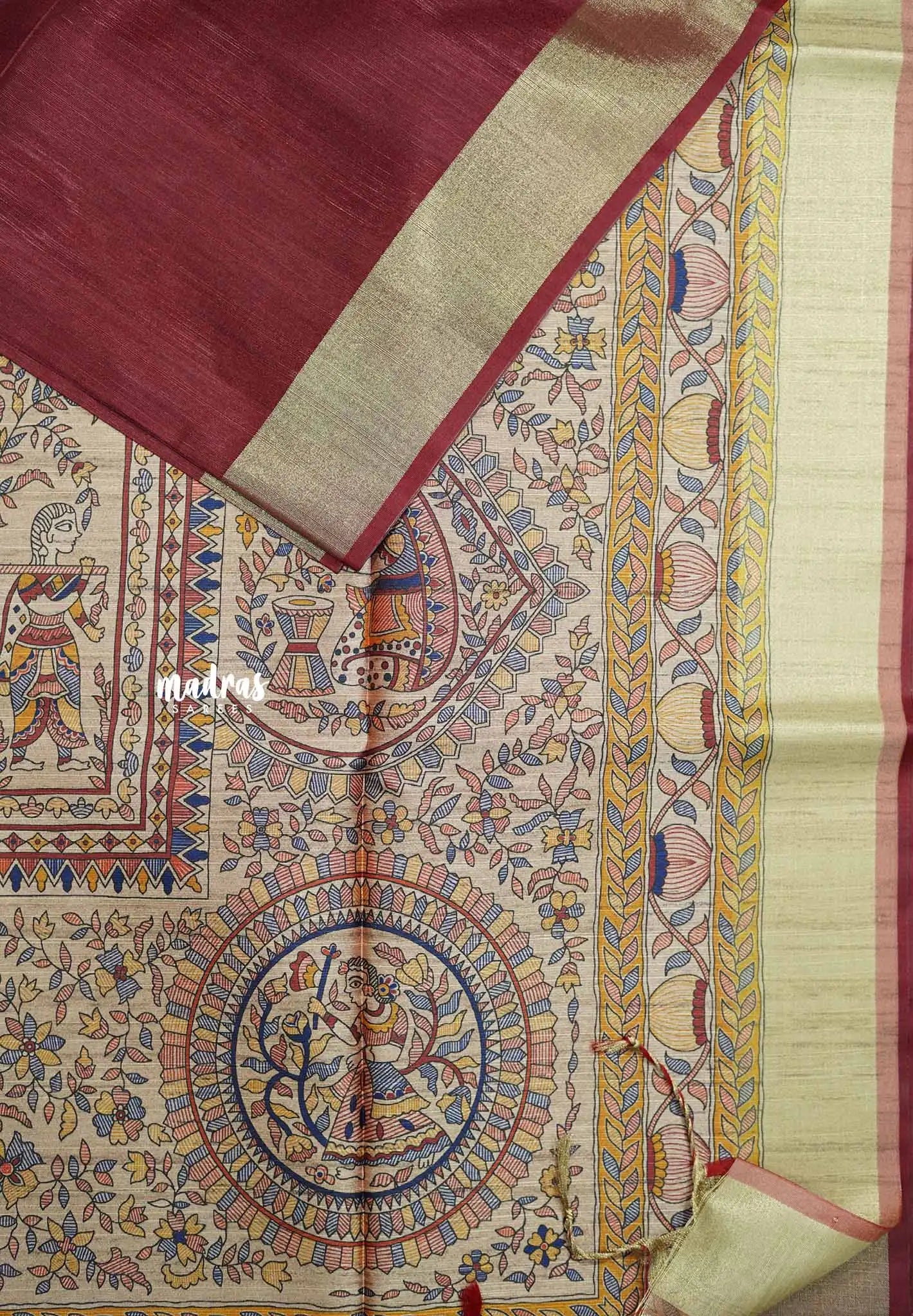 Deep maroon - Roopa - Premium Chappa semi tussar with Madhubani art pallu