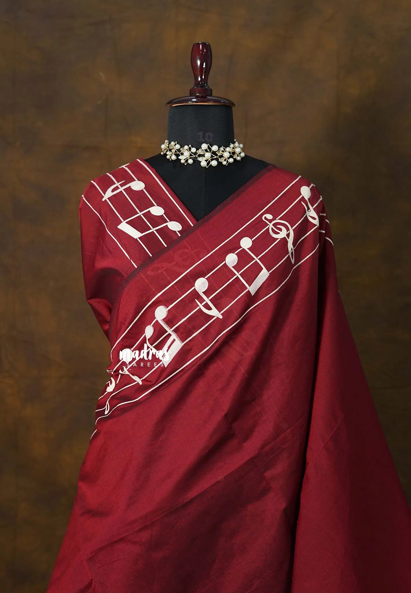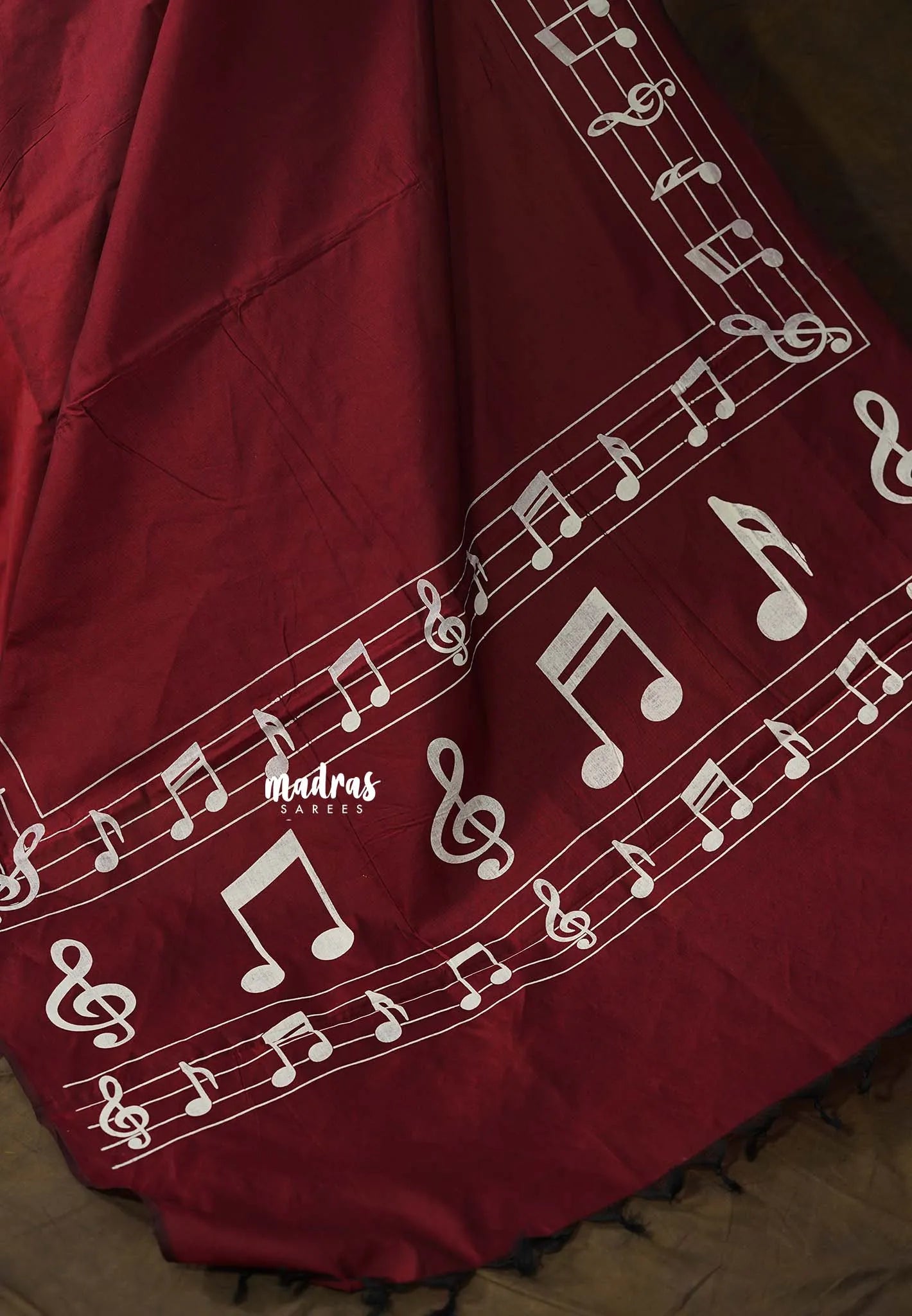 Deep Maroon - sindhu bhairavi - Madras Margazhi Special Handpainted Bamboo Cotton Saree with music notes