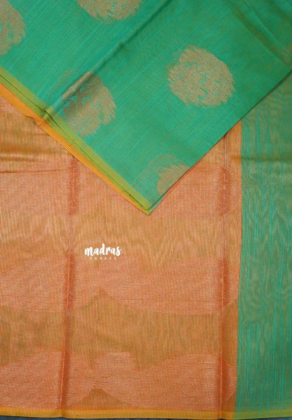Dual Shade Emerald Mist - Soft jute banarasi with lotus buttas contrast pallu and tissue blouse- Best for Wedding Functions