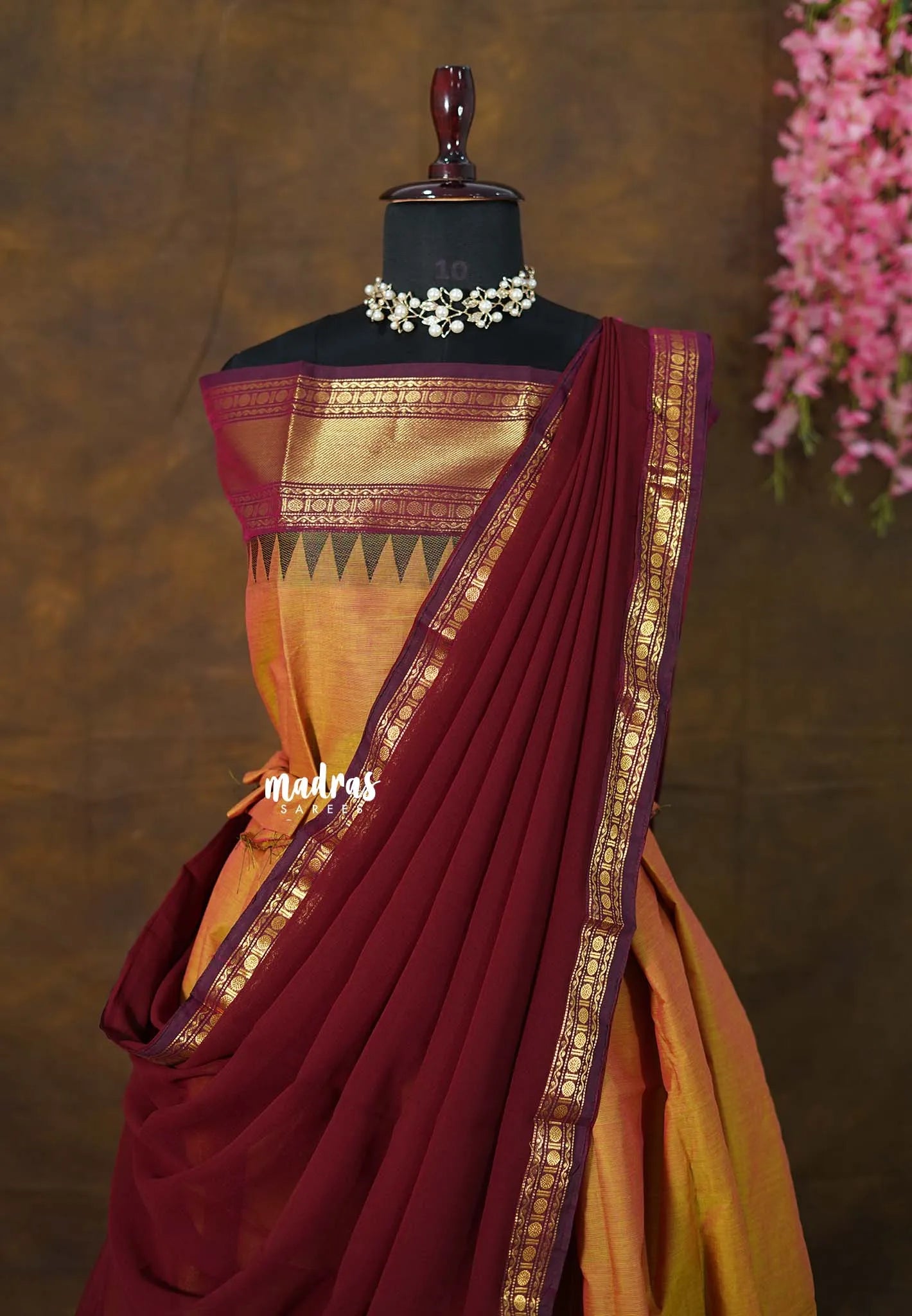 This traditional maroon half saree features a rich golden zari border, paired with a vibrant golden mustard skirt and blouse for a striking contrast. The look is simple yet graceful, making it perfect for festive and traditional occasions.