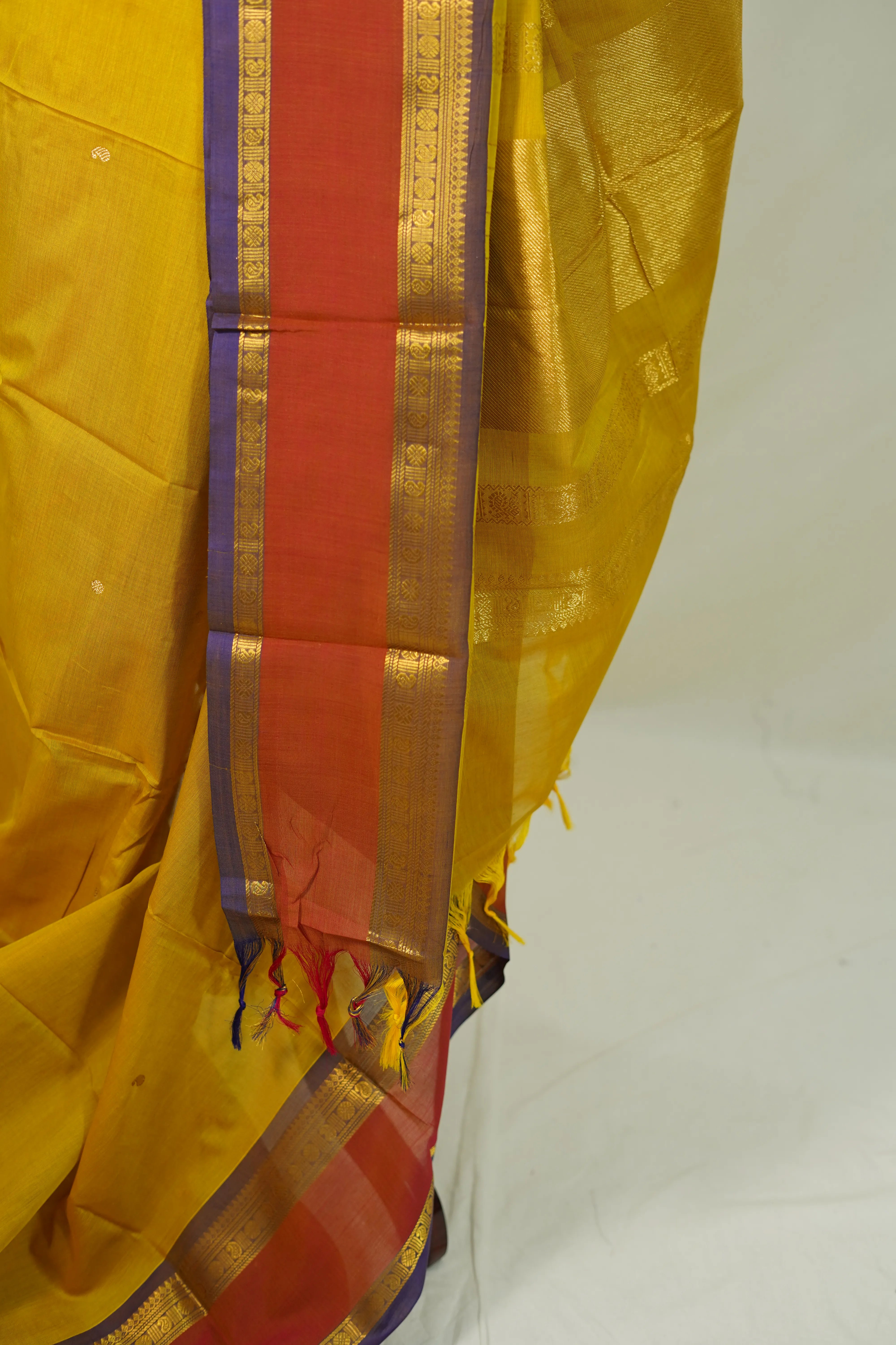 Dual shade Golden Turmeric Yellow - Vaibhogam 120 count Pure mercerized silk cotton with buttas and rettapet border