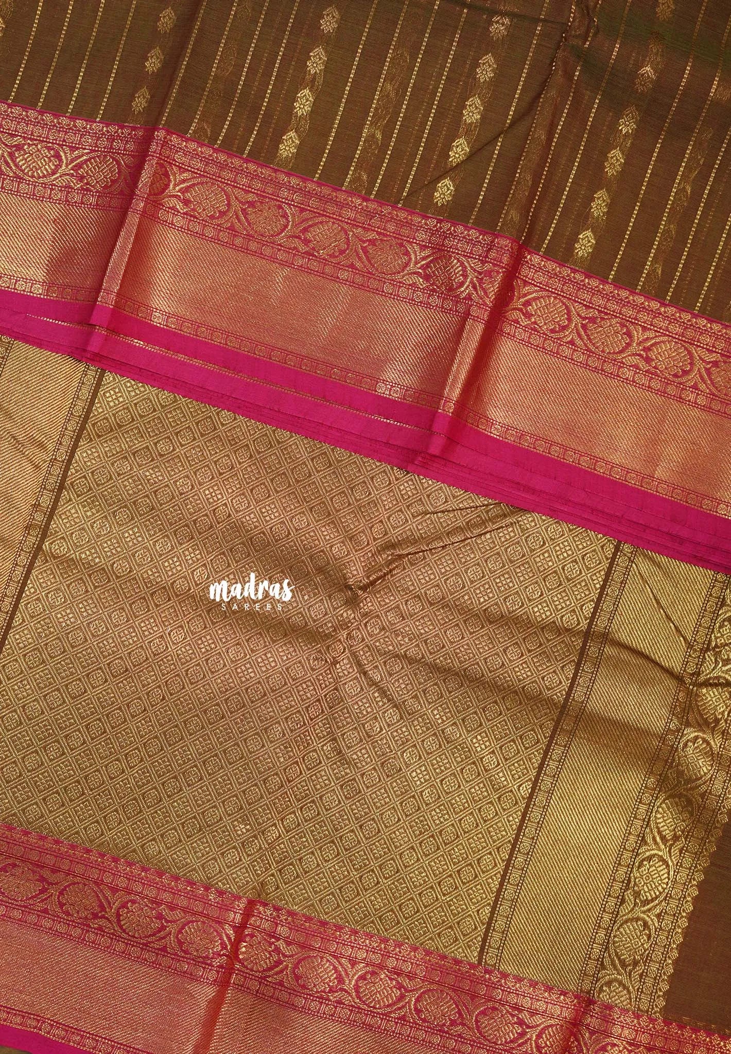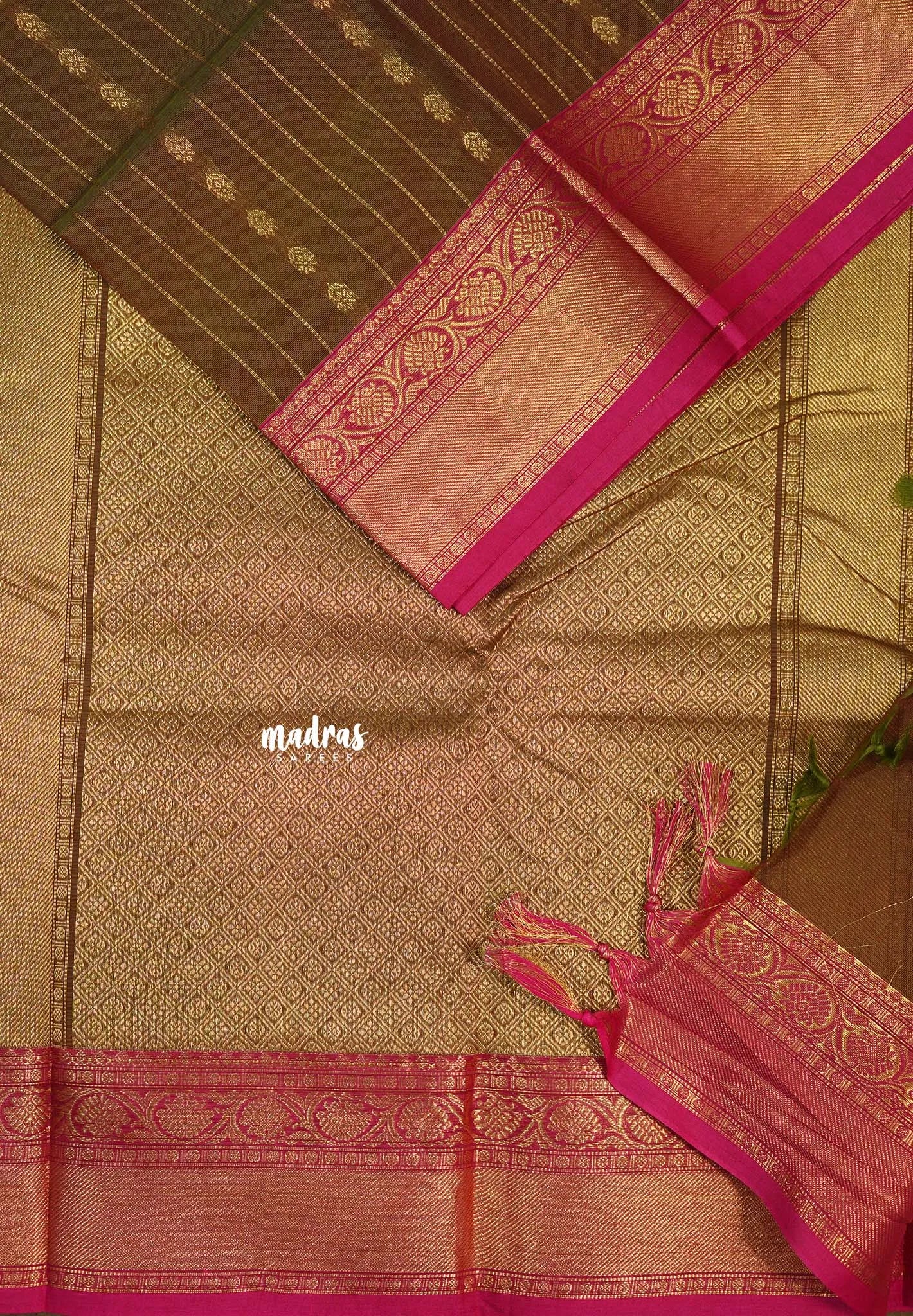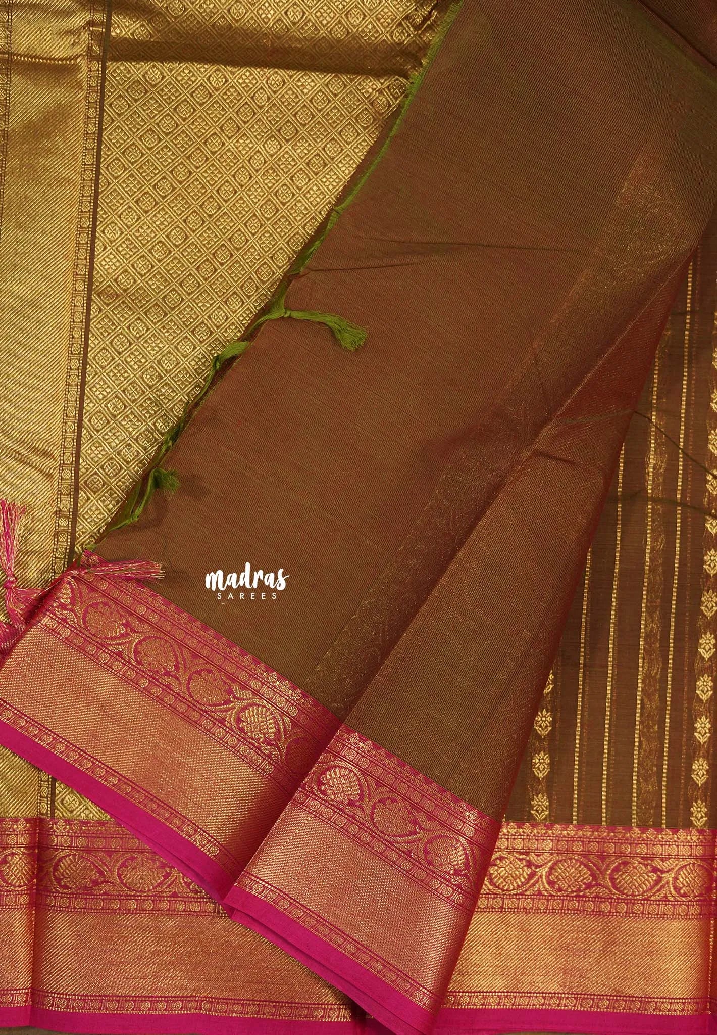 • Our curated collection showcases a variety of Korvai silk cotton Sarees in Kanchipuram, reflecting the cultural heritage of South India. Contrast Border with Rich Zari heavy Pallu