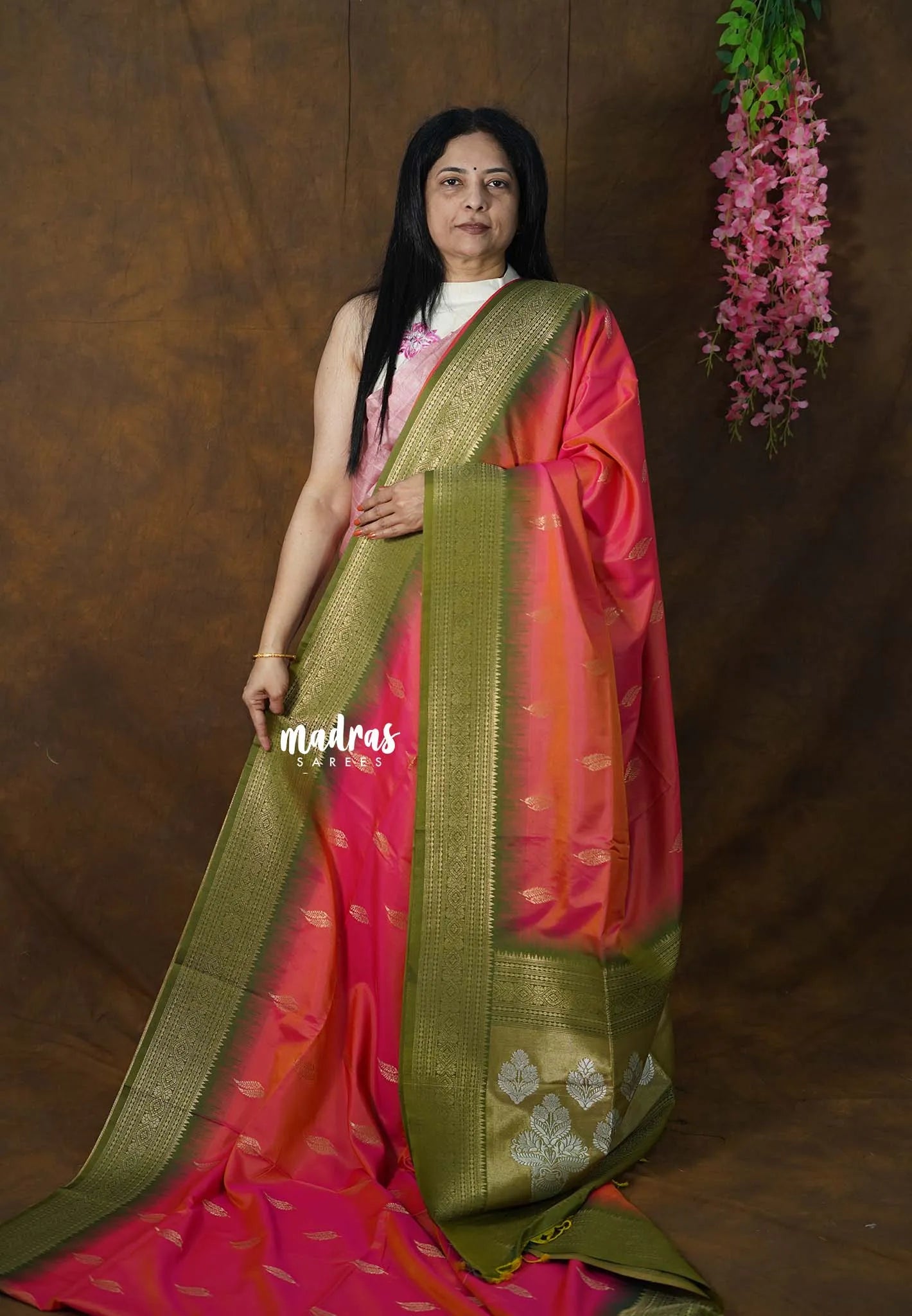 Dual Shade Pinkish Orange - Kanimozhi - Soft Silk Saree with Leaf Buttas - Perfect for Festive Wear