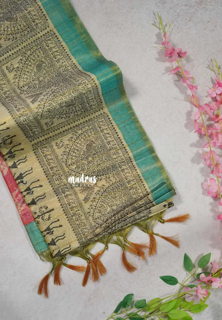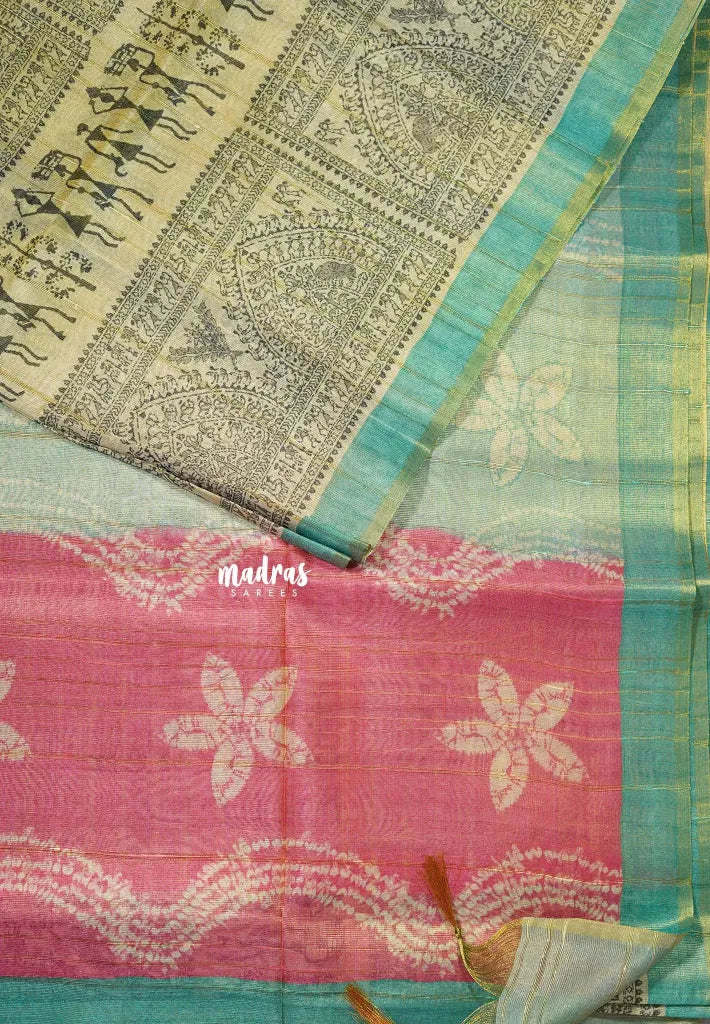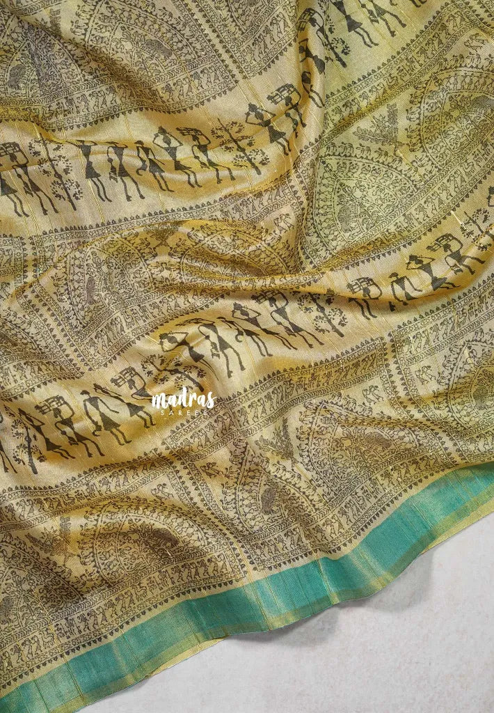 Sandal Beige with Teal - Roopa - Premium Chappa semi Tussar Tissue Blend with Warli Prints -  Perfect for Small Functions