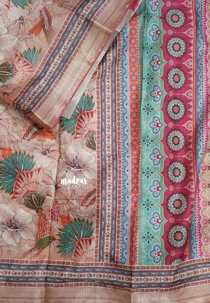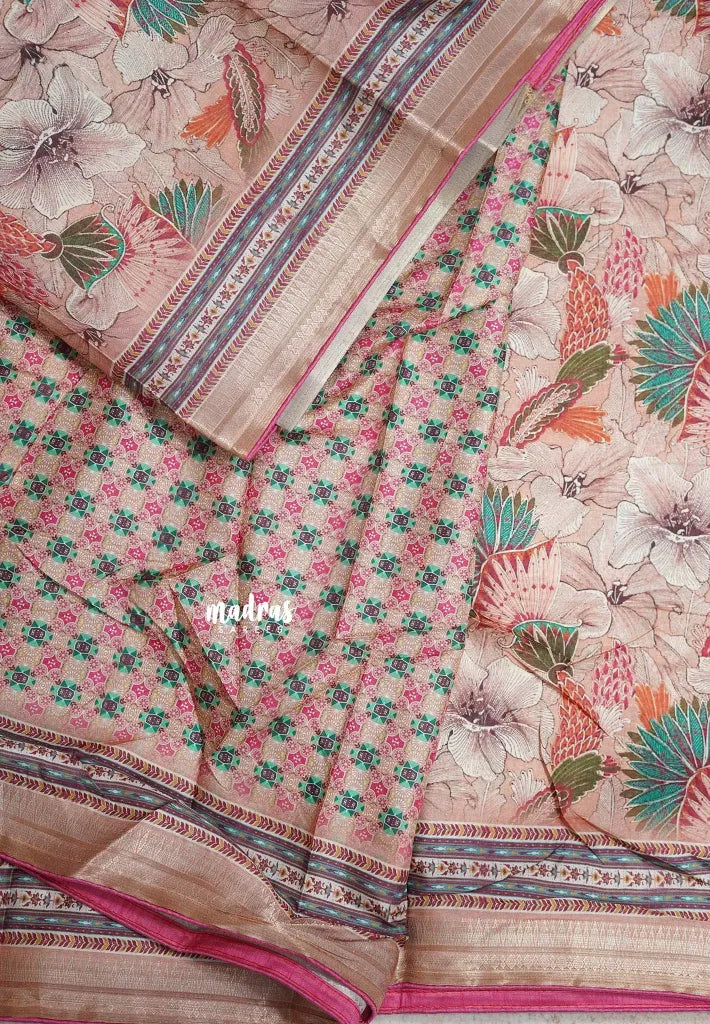 Earthy Peach with Pink Piping - Malai Silk with Floral Prints and Small Border with Piping - Best for Regular Wear