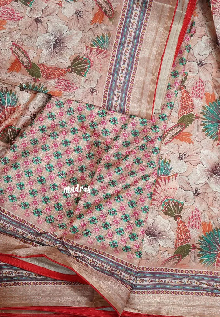 Earthy Peach with Red Piping - Malai Silk with Floral Prints and Small Border with Piping - Best for Regular Wear