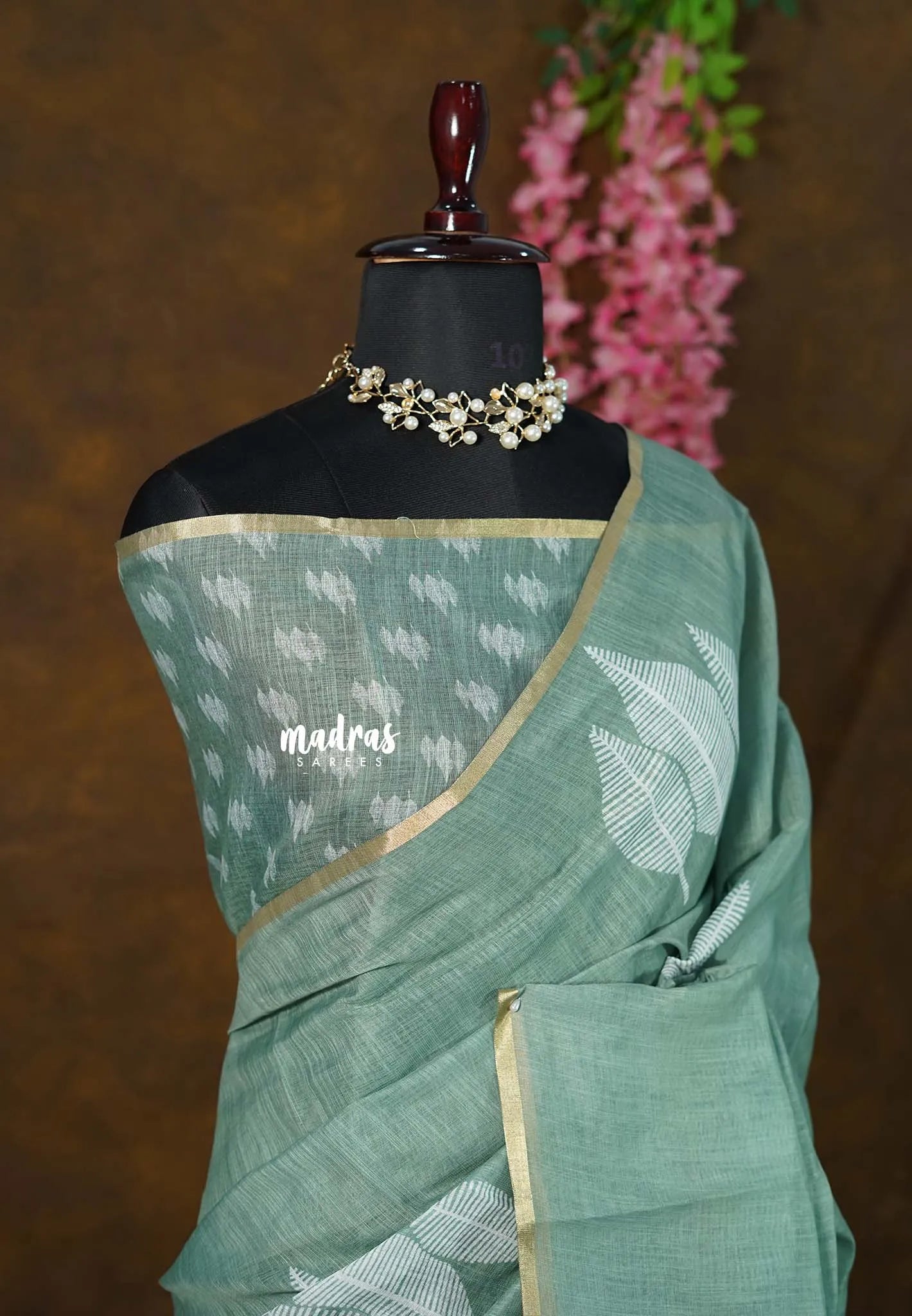 Earthy Seafoam Green - Linen Cotton Saree with Leaf Print with Tiny Border - Best for Office Wear