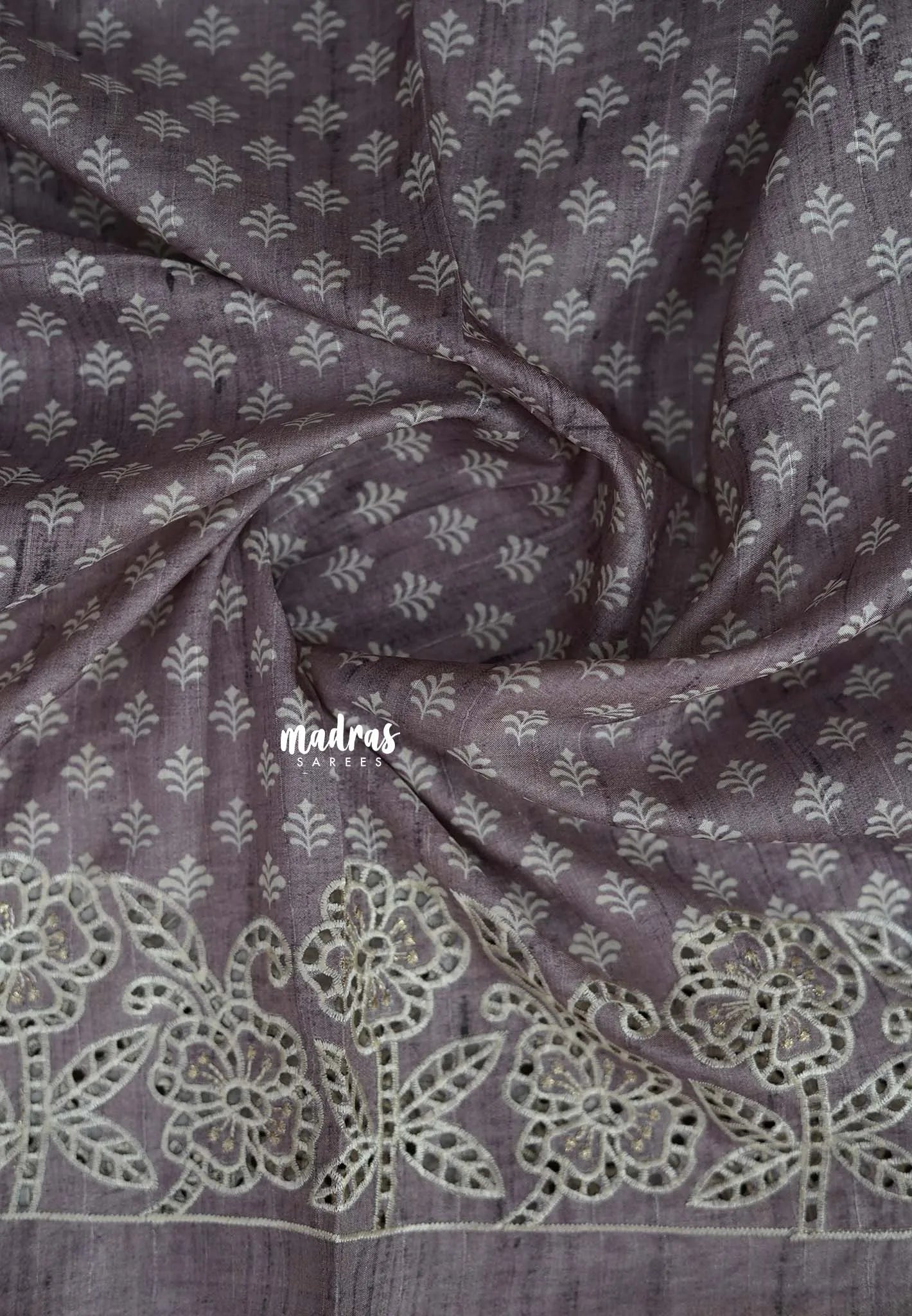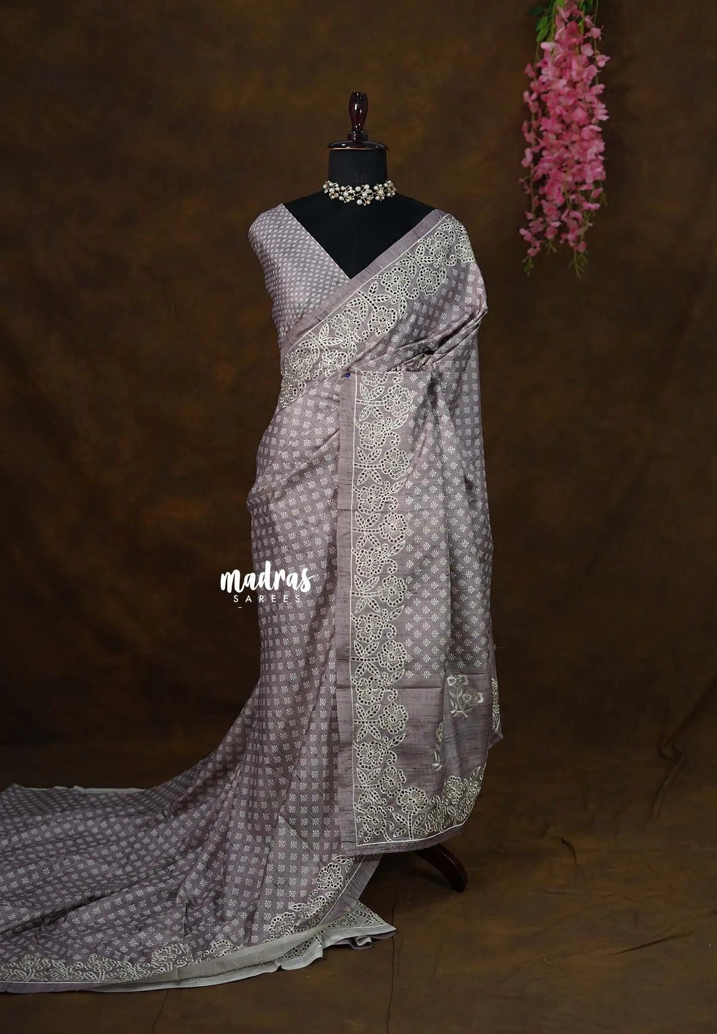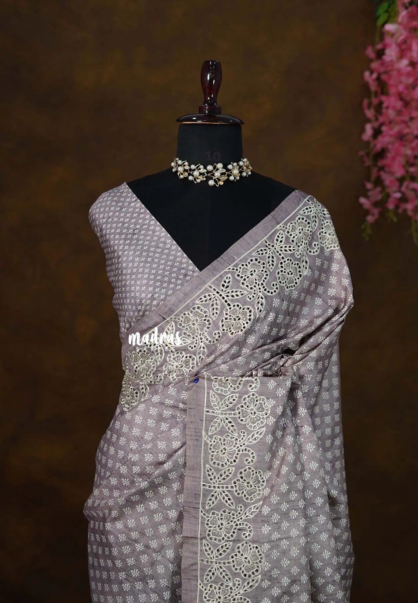 This elegant semi tussar saree comes in a refined pastel base, beautifully complemented by an floral cutwork border. The soft, lightweight texture ensures a graceful drape, while the delicate cutwork adds a timeless handcrafted charm.