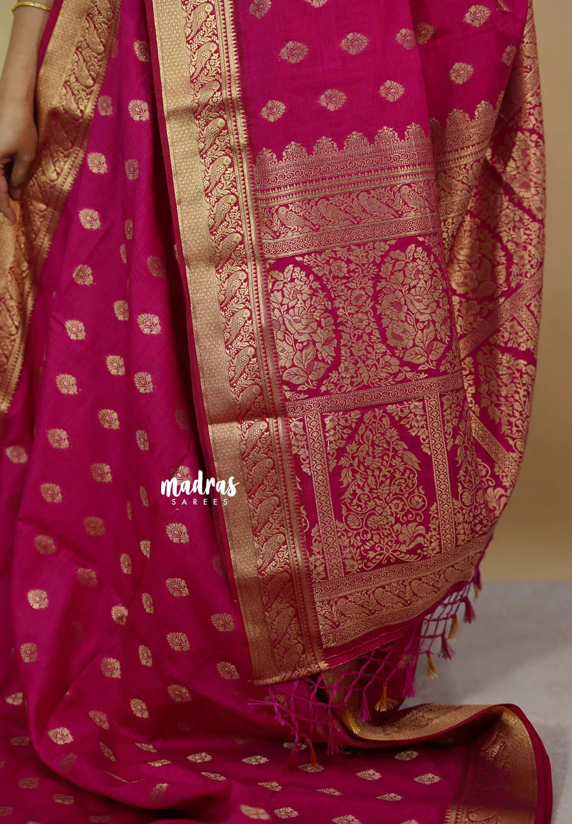 Fuchsia Pink - Vadhanam - Premium Jute Tussar silk with buttas and gold zari border