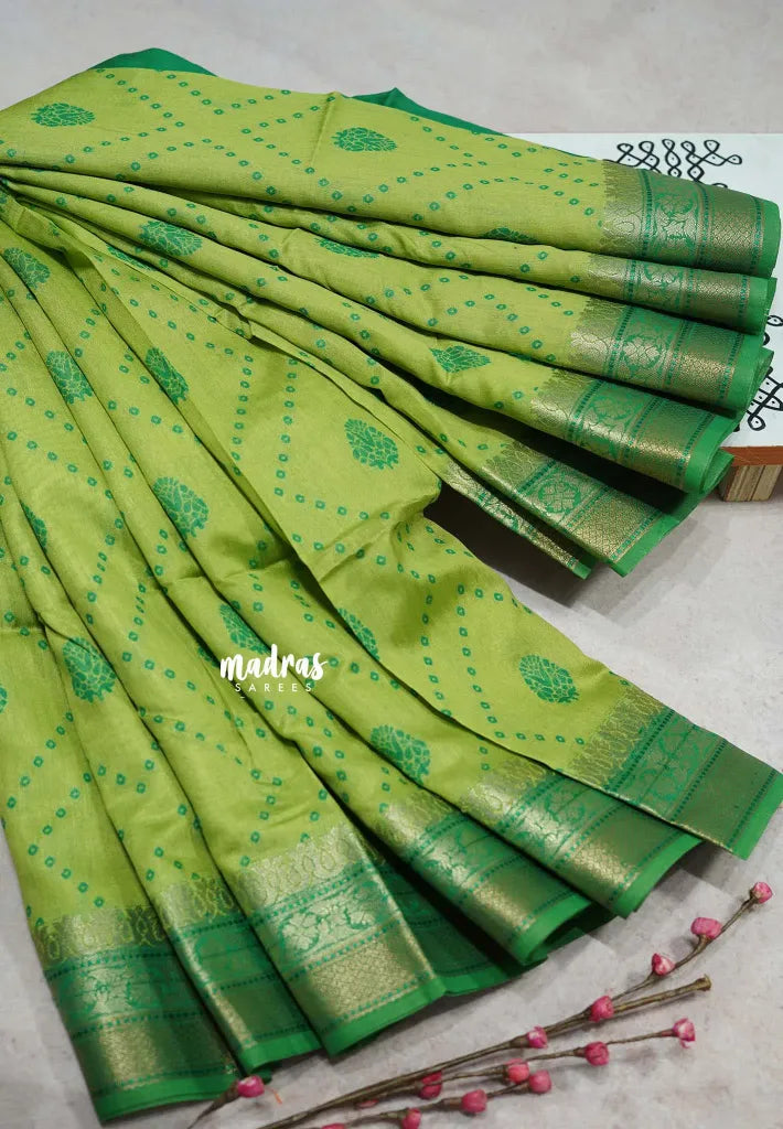 A vibrant green Manjari semi raw silk saree adorned with delicate motifs and finished with an intricate zari border. Lightweight yet elegant, this saree blends tradition with a graceful contemporary charm. Perfect for festive and special occasions