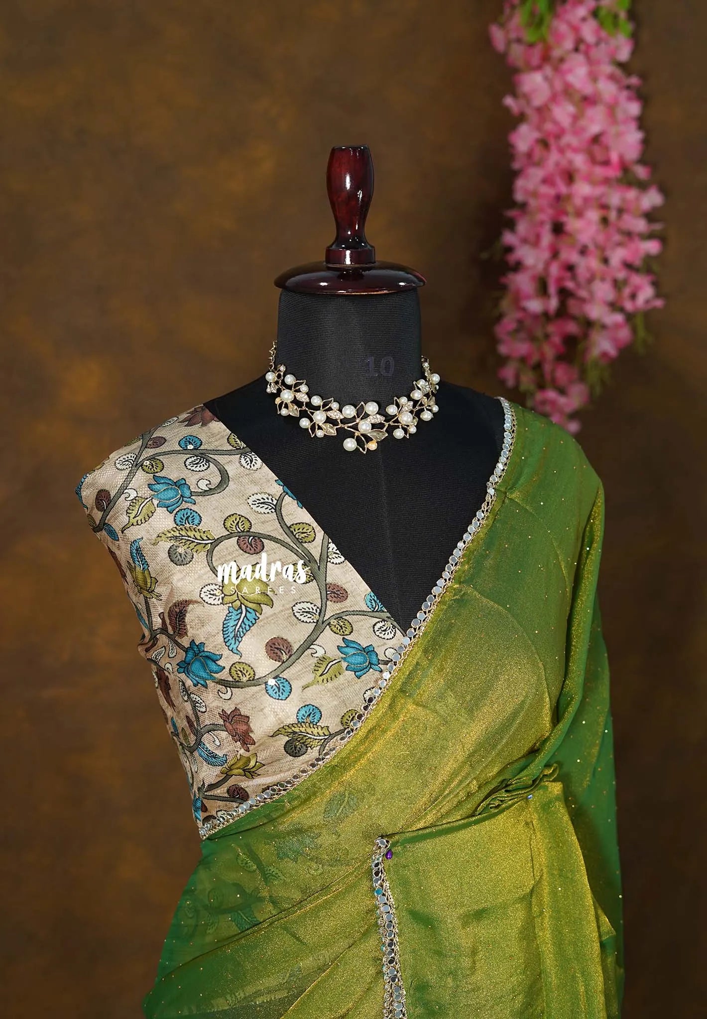 Paired with a designer blouse, the contrast blouse adds a lively colour, transforming the saree into a stylish, contemporary festive ensemble.