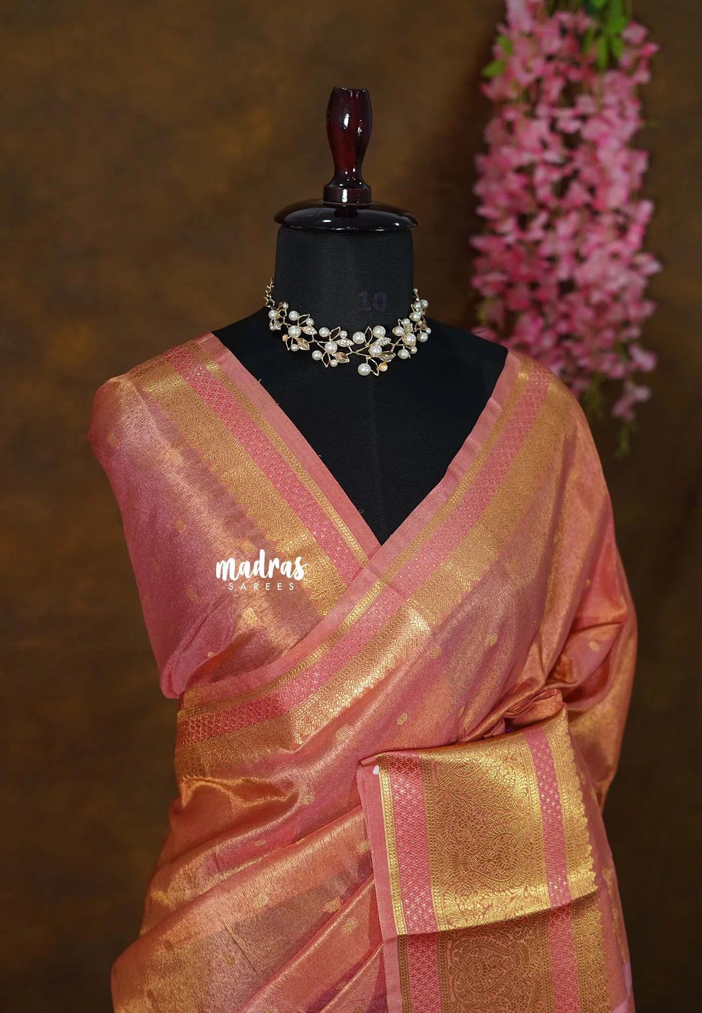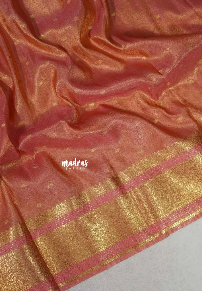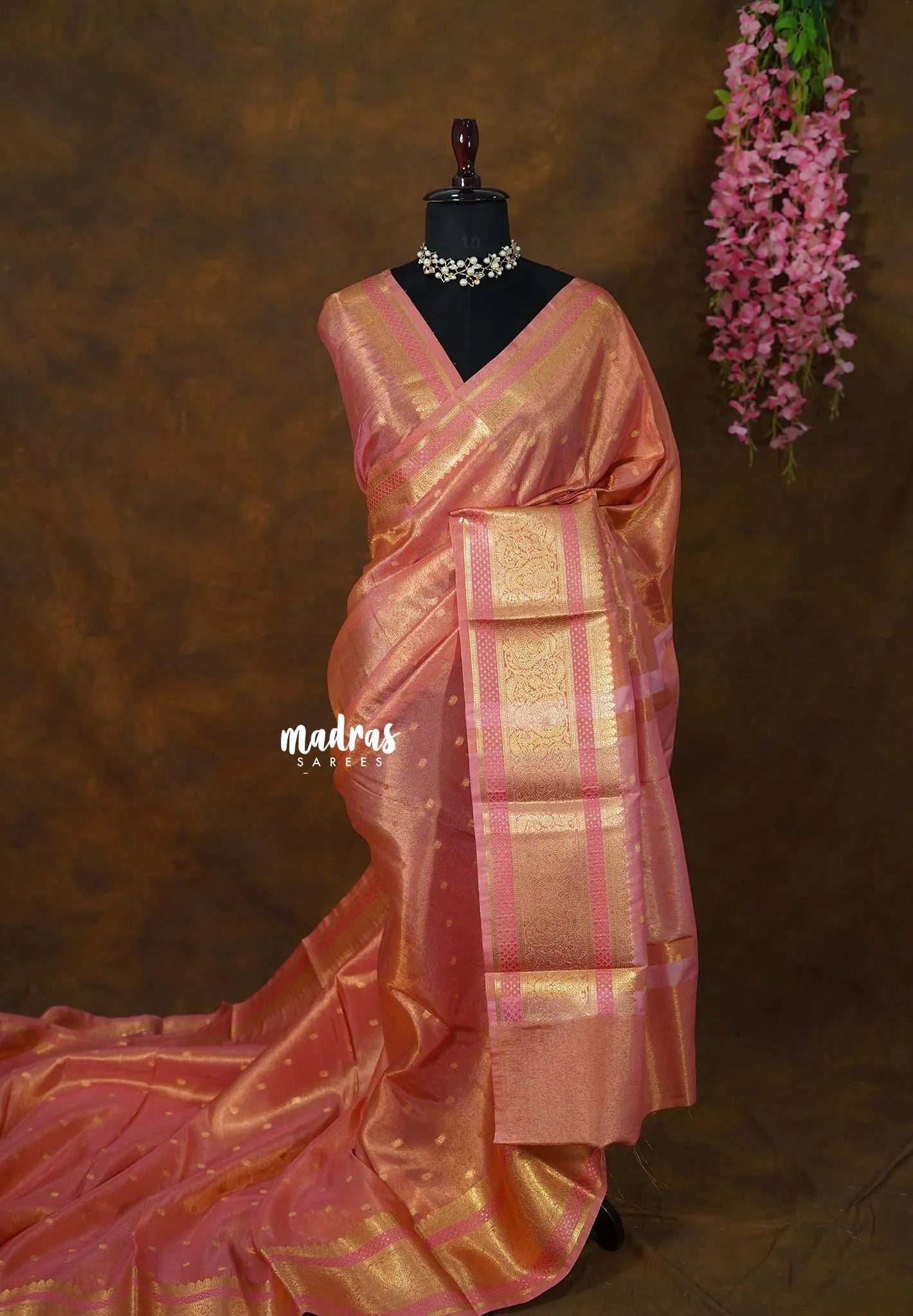 The stunning designs of soft tissue silk sarees are always in style. Grandeur of a Tissue Silk Saree can only be experienced when worn - Festive luxuriance at its best. This saree comes with blouse