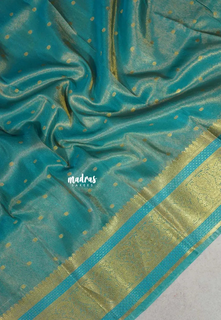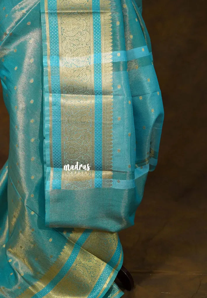 Golden Shade Cyan Blue - Thendral - Kanchi Soft Tissue Silk Saree with Rich Pallu and Blouse - Perfect for Wedding Functions