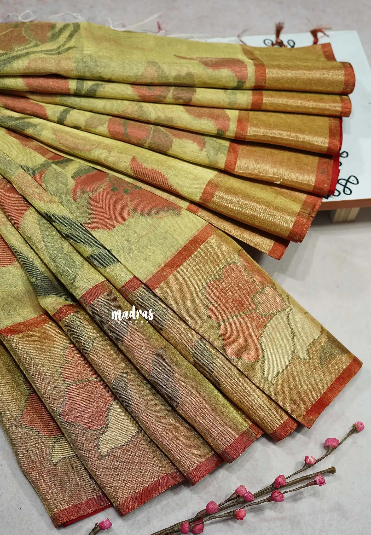 This lightweight ikkat Pochampally saree, adorned with floral weaving, is perfect for any occasion. Its light fabric and quality tissue border offer a graceful touch, while the premium quality enhances your divine beauty.