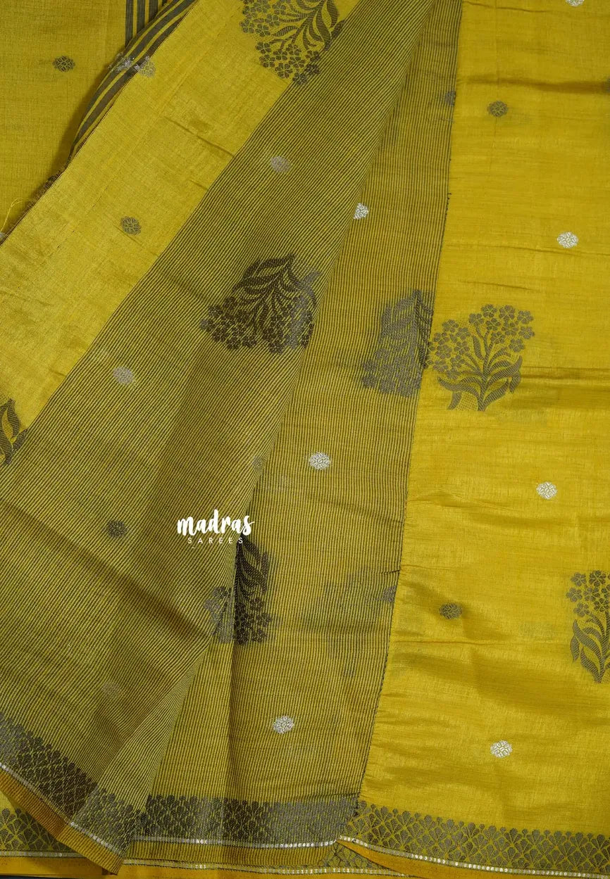 Greenish Yellow - Raaga - Semi Tussar with Thread Floral Buttas and Small Border- Best for Gifting