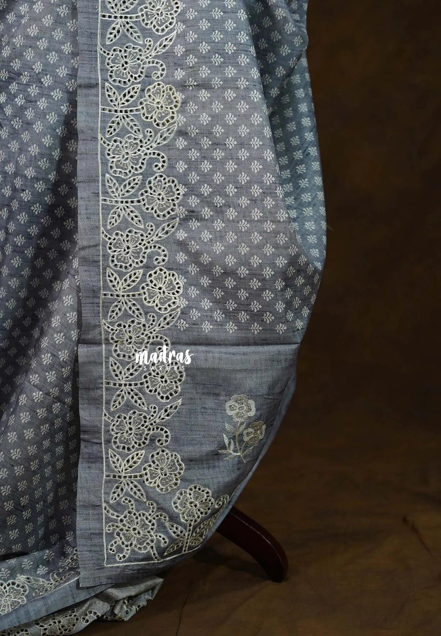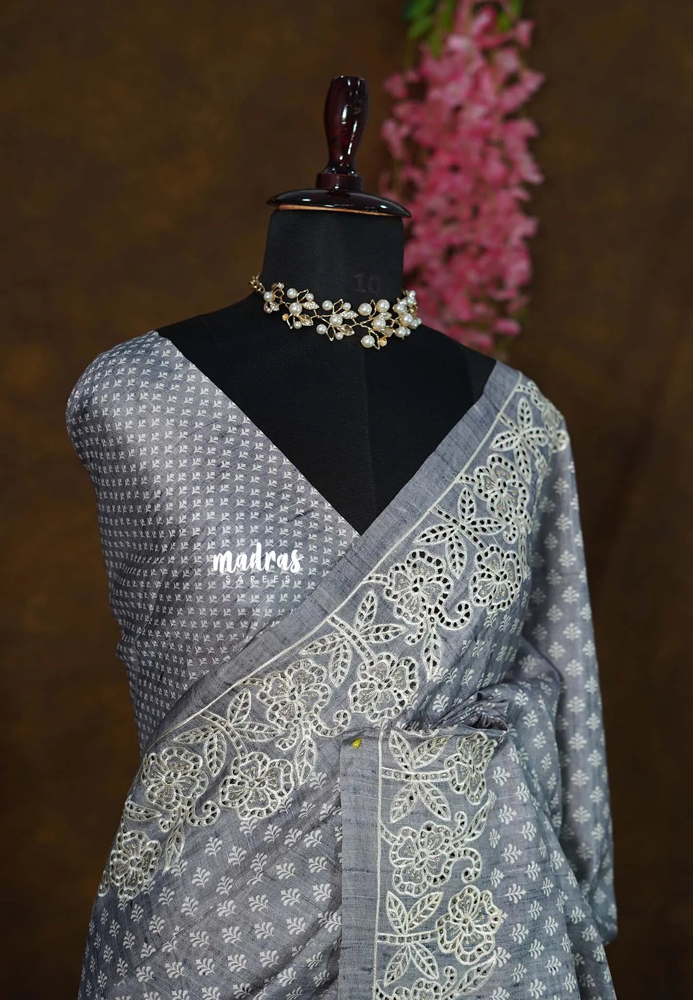 Moonstone Grey - Veena - Lightweight Semi tussar saree wtih floral cutwork border - Perfect for Office Wear
