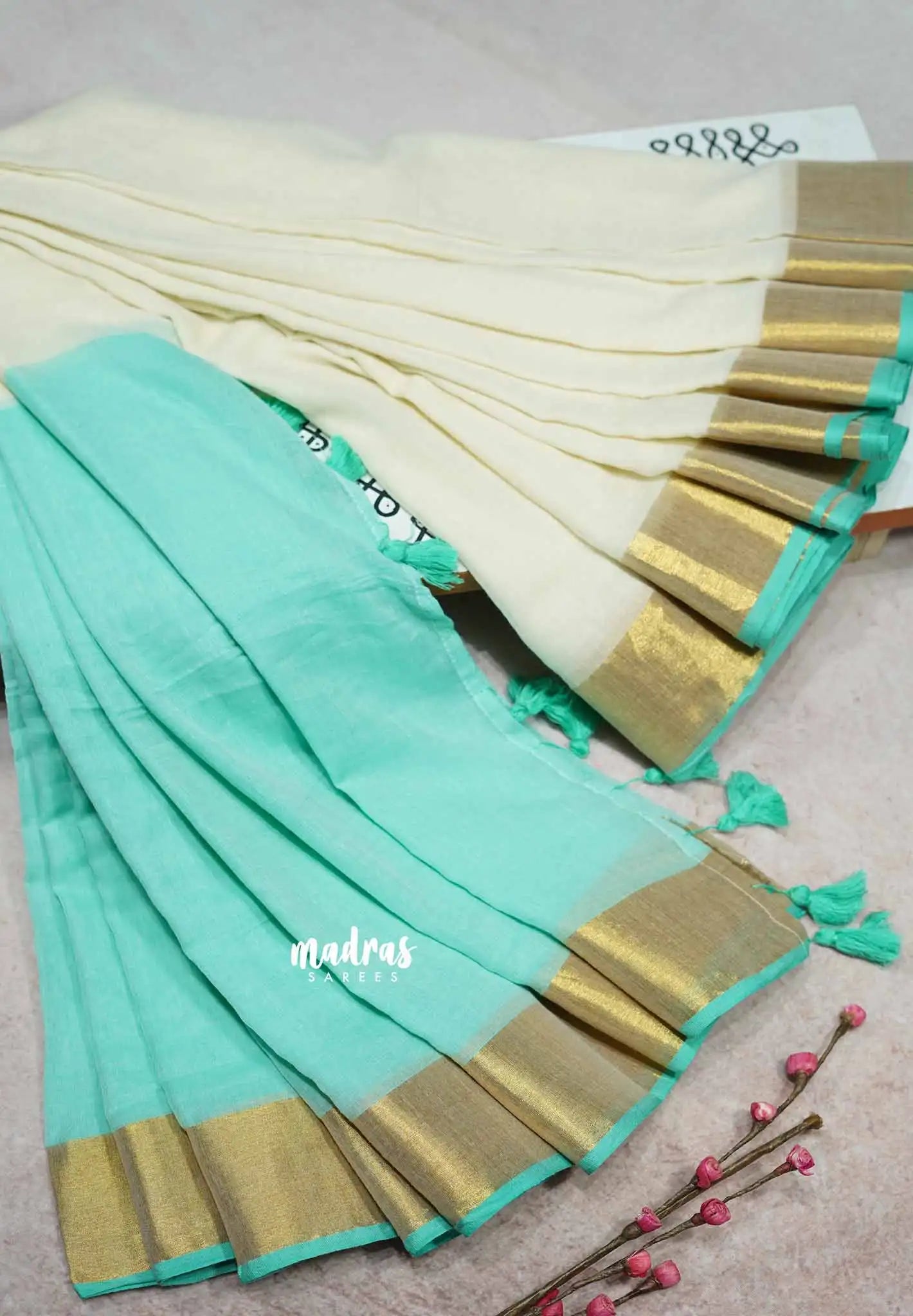 Effortlessly elegant and beautifully versatile, this 2-in-1 Kerala Mul Cotton Saree features a soothing half-white body with a teal green pallu, highlighted by a classic gold zari border. Flip the drape and transform your look with its fully reversible design – wear the blush teal side for a fresh pop or keep it traditional with serene ivory tones.