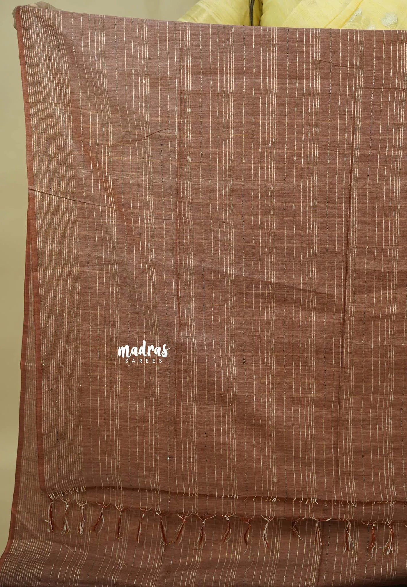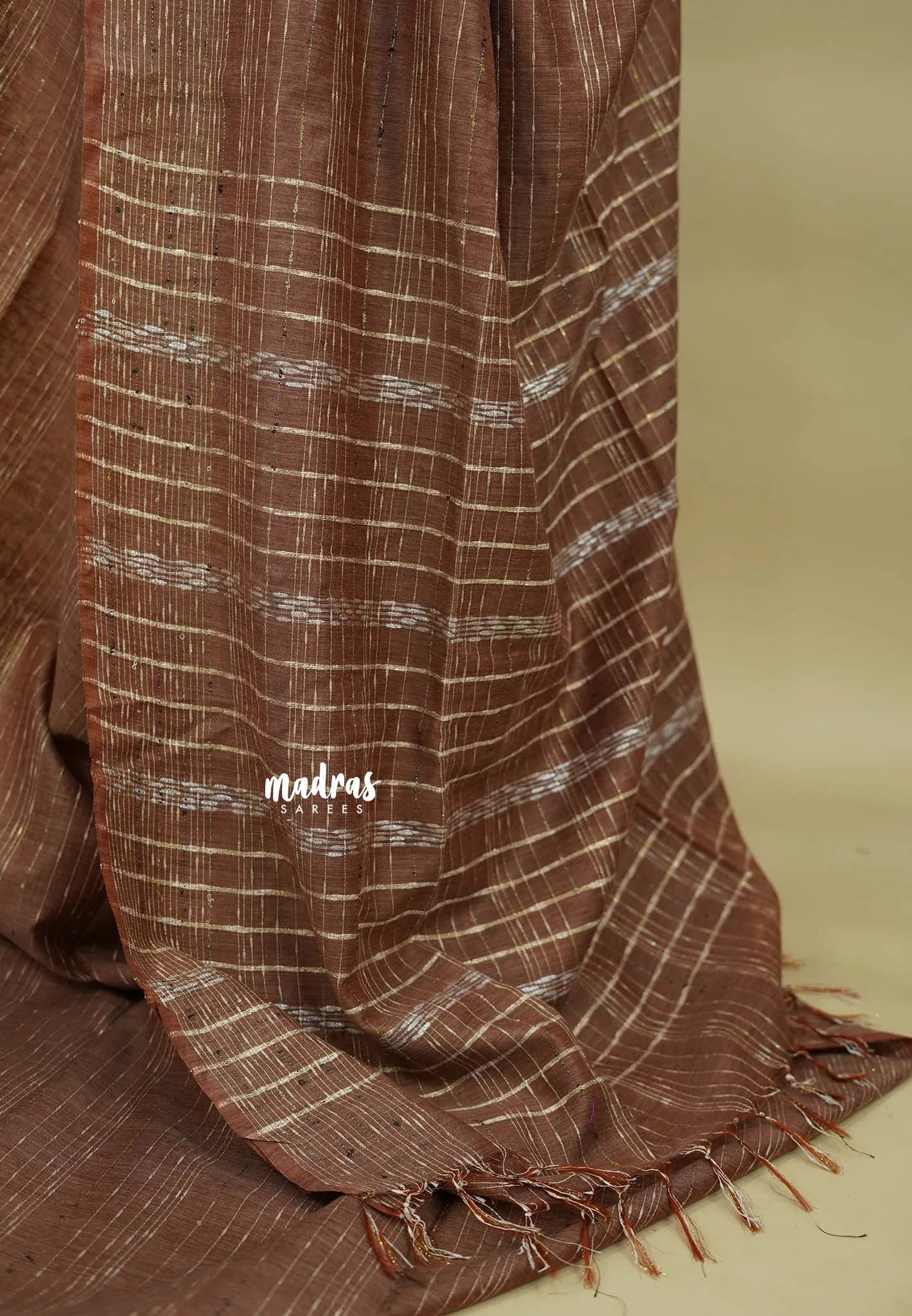 A luxurious silk linen drape with a rich, earthy undertone. Adorned with delicate golden thread stripes that add subtle charm. An elegant choice for timeless sophistication in every occasion.