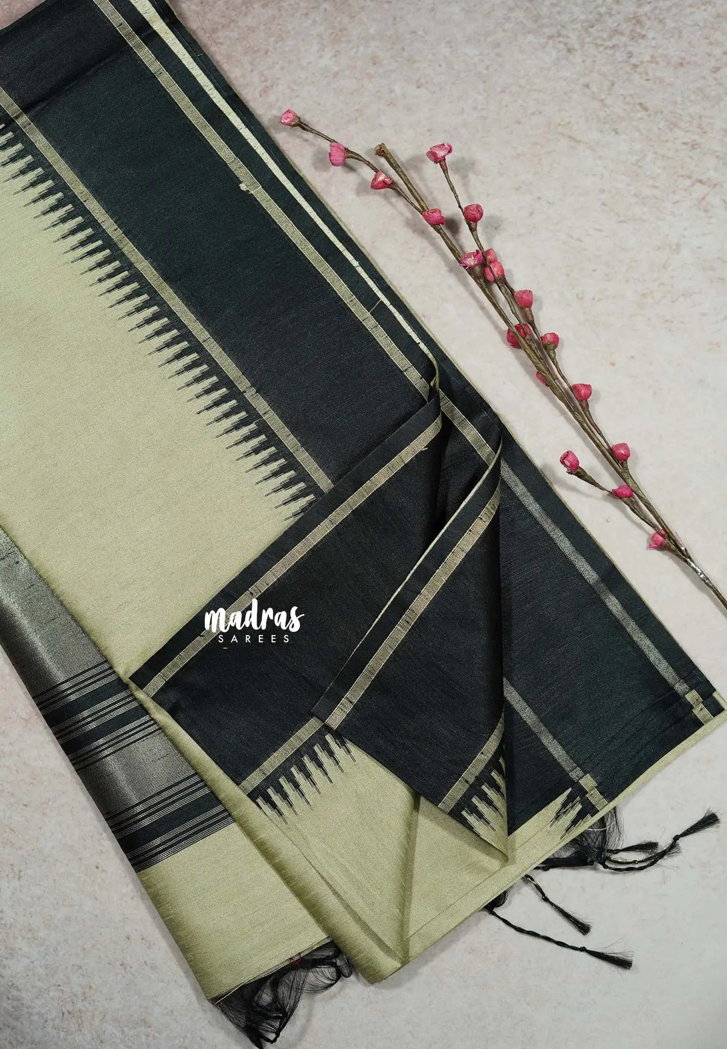 This exquisite handwoven saree is a true celebration of heritage and elegance. The body stands out with its rich contrast, while the bold temple border adds a majestic touch of tradition. The pallu is gracefully detailed with fine stripes, giving it a timeless appeal. Finished with dainty tassels that sway with every movement, this saree is perfect for making a grand statement at festive gatherings and special occasions.