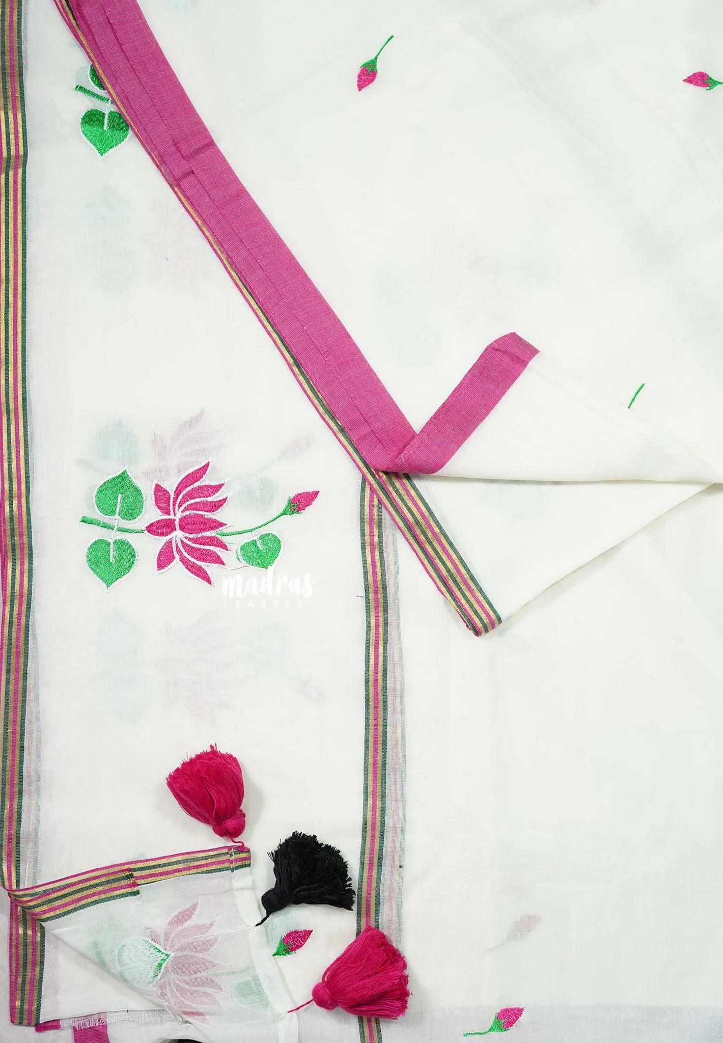 Soft, breathable, and summer-perfect—this Mul cotton saree features elegant Divine Lotus Embroidery with tiny border. Lightweight with a gentle sheen, it blends comfort with timeless style.