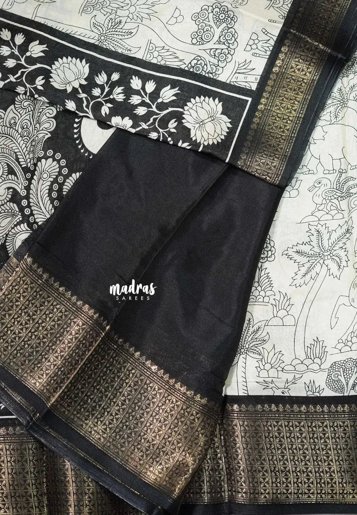 Ivory white - Malgudi printed silk nature prints with zari border Design 3 - Best for Office Wear | Casual Wear