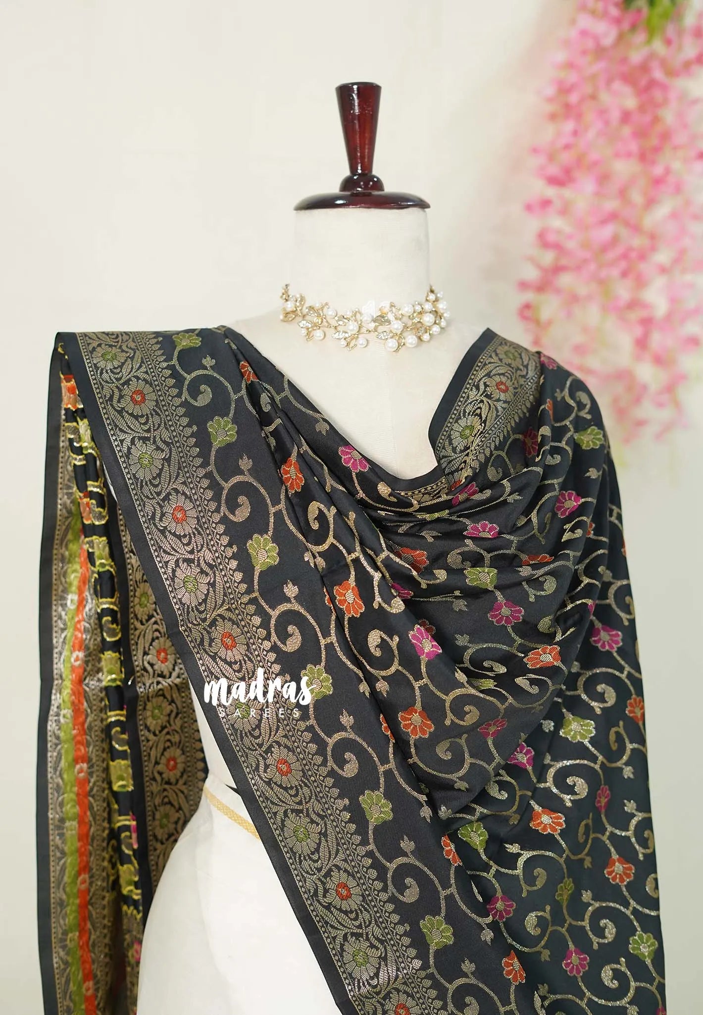 A regal black Banarasi dupatta adorned with intricate zari vines and delicate multicolor floral motifs. Finished with a rich woven border, it brings timeless elegance to any festive or classic ensemble