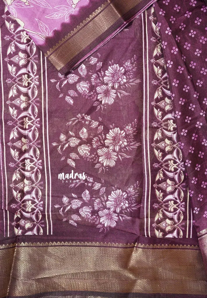 Exquisite floral-printed silk saree featuring a deep, regal base adorned with blooming pastel flowers. Its rich mustard-gold zari border adds a striking touch of opulence, making it perfect for elegant occasions.