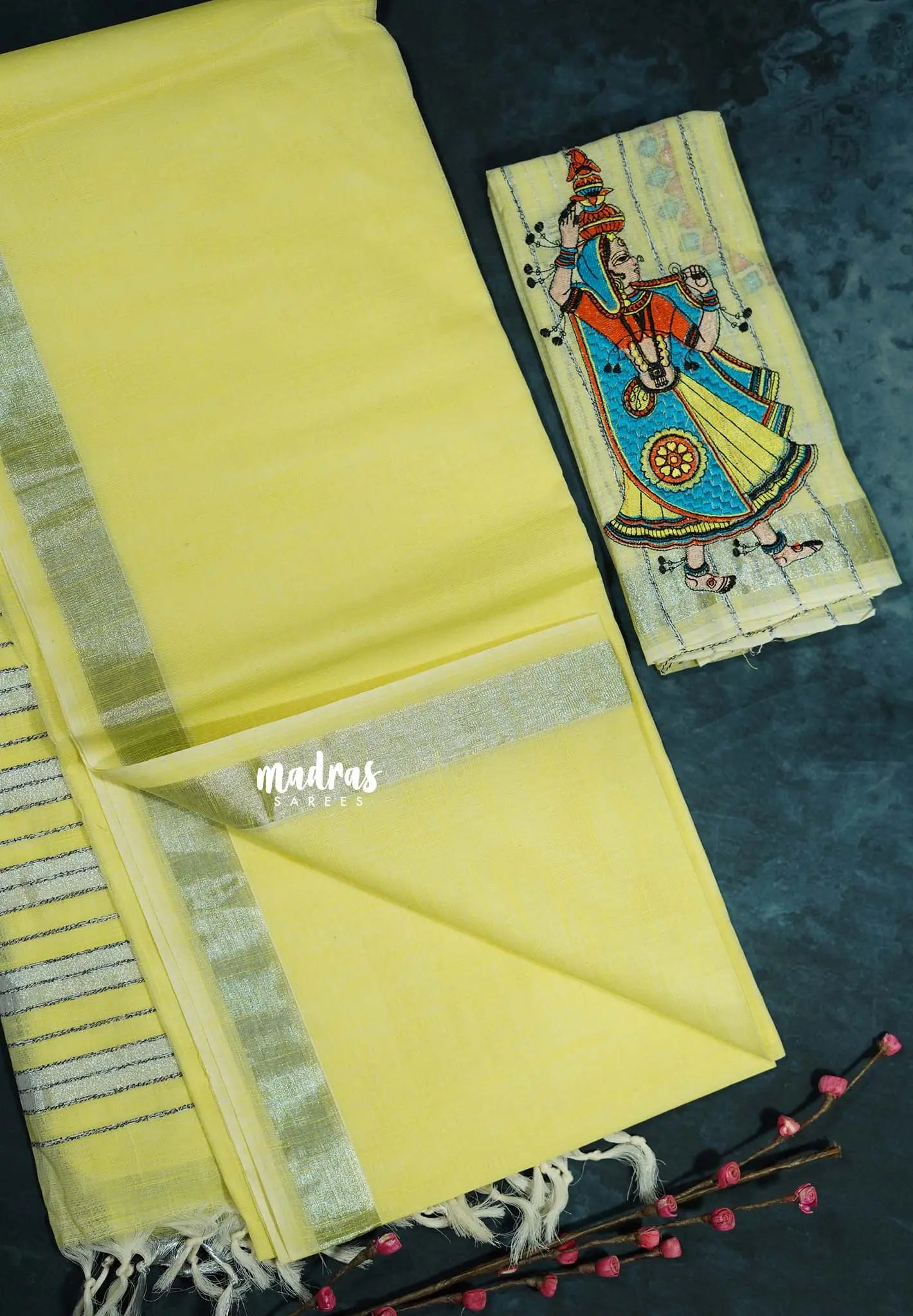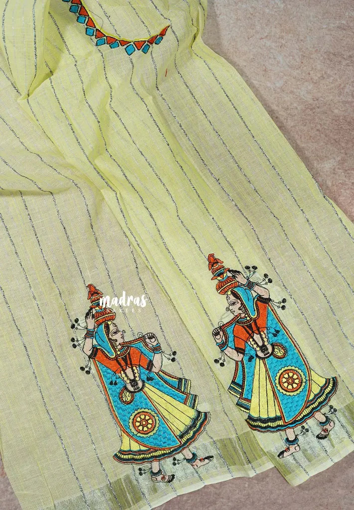Blouse: A beautifully embroidered blouse featuring a Rajasthani dancer motif. The intricate detailing in shades of orange, blue, and yellow creates a striking contrast, adding a touch of cultural elegance to the ensemble.