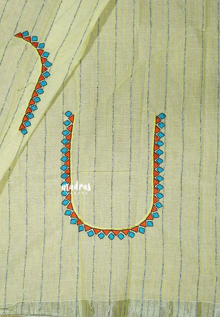 A graceful fancy cotton saree with subtle white pinstripes, offering a lightweight and airy feel. The soft texture and delicate tassel details on the pallu add to its contemporary charm, making it perfect for casual and festive wear.