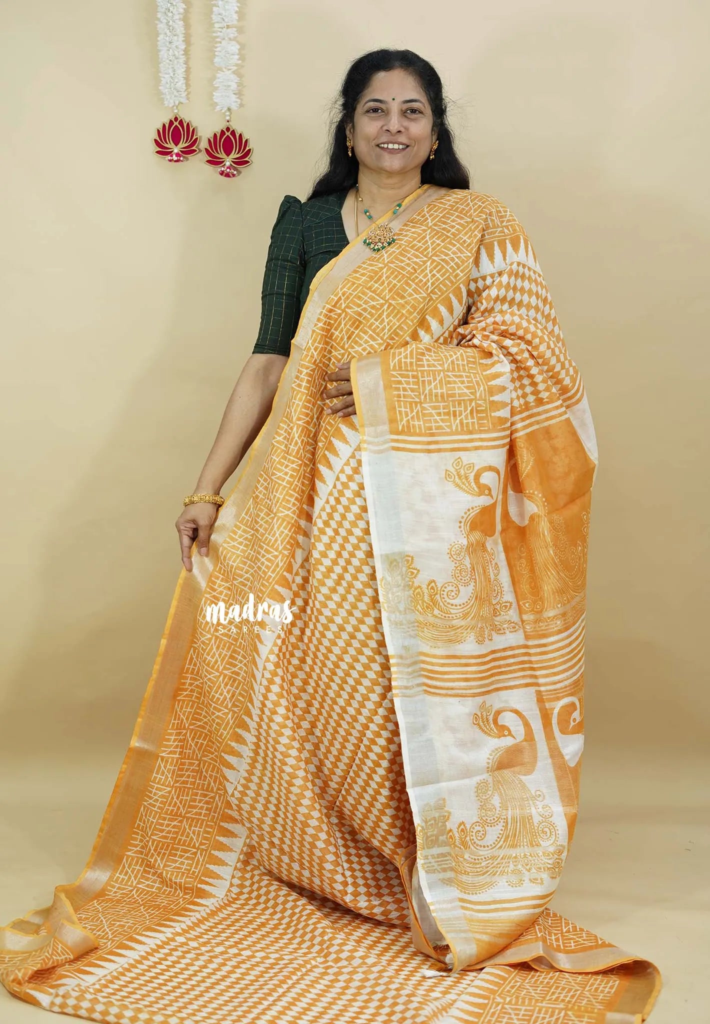 Magic Mustard Yellow - Soft linen cotton Trendy printed saree with Silver Zari Border