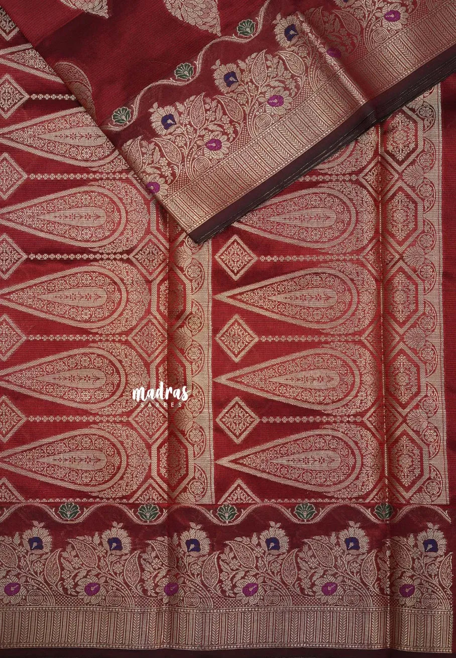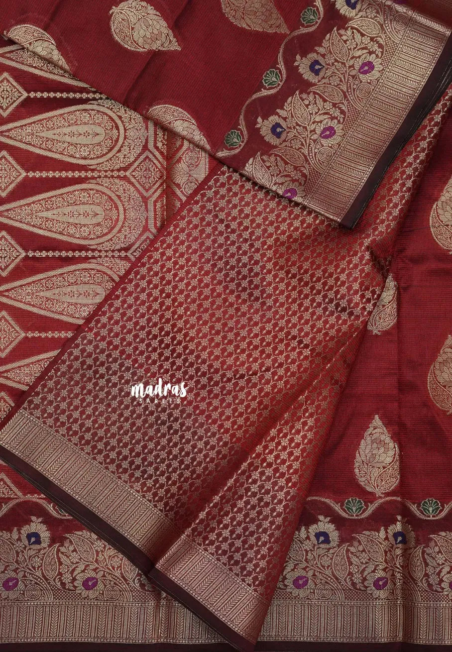 “Durga – A rich Banarasi semi Dupion silk saree featuring elegant zari across the body, complemented by a lustrous border and pallu. A timeless weave that brings grace and grandeur for any occasion.”