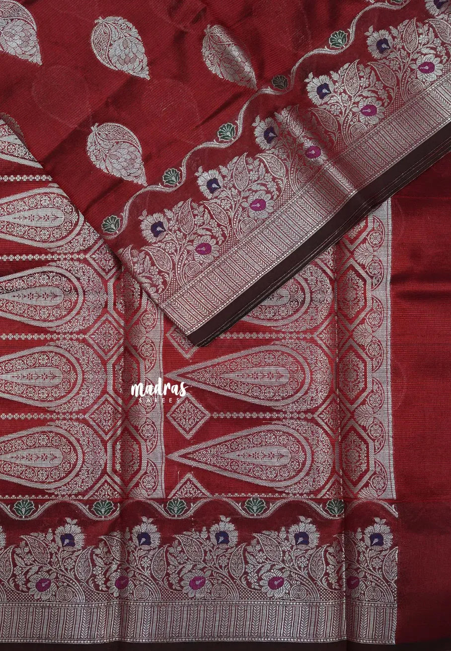 Majestic Maroon - Durga - Banarasi Semi Dupion silk with Silver Zari Buttas and Border - Best for Function Wear