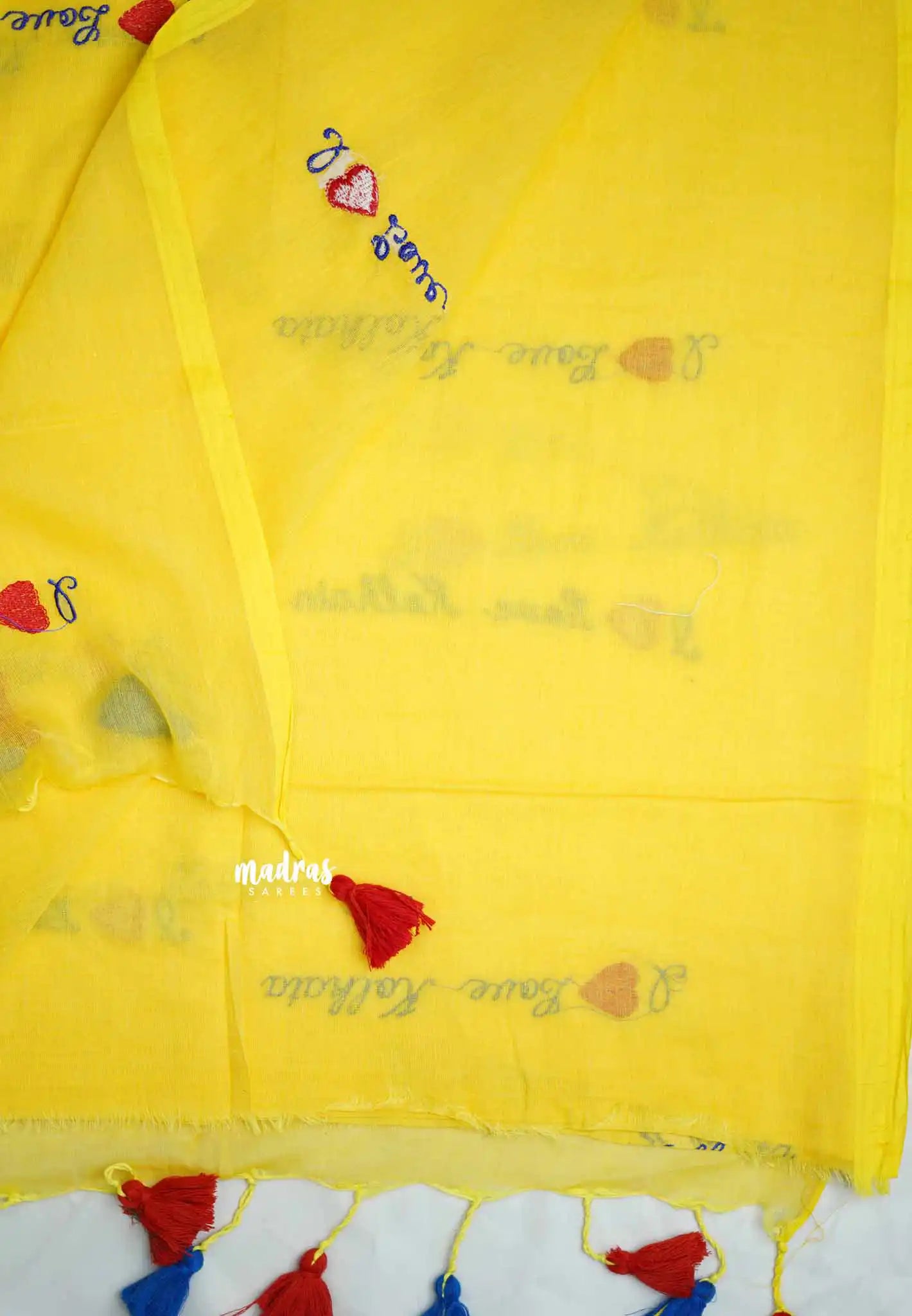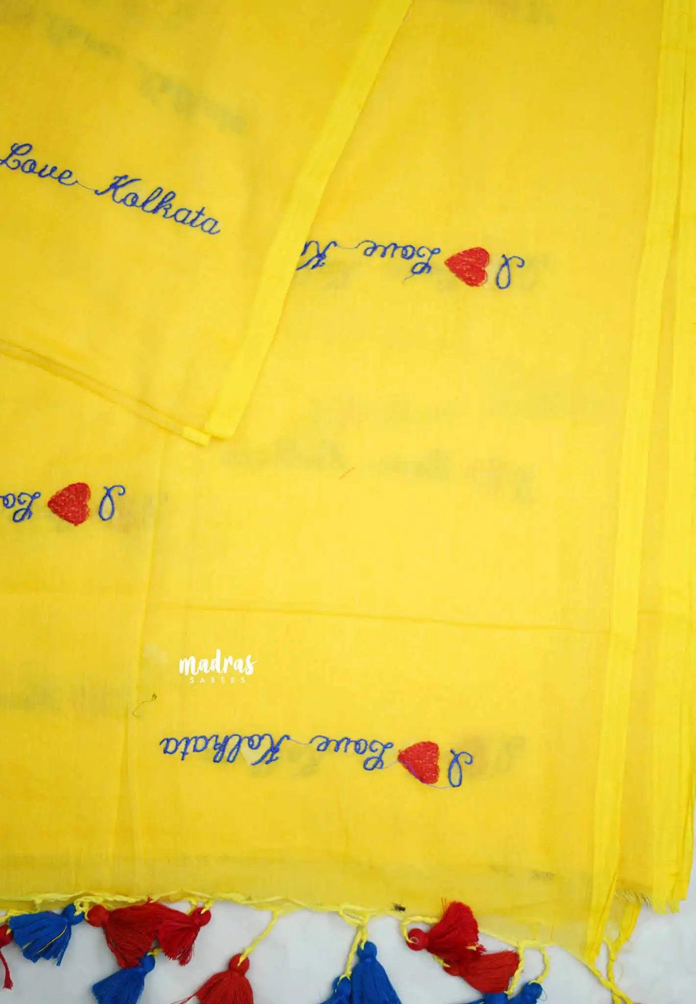 Mango Yellow - Soft Mul cotton I love Kolkata Embroidery saree - Best for Regular Wear