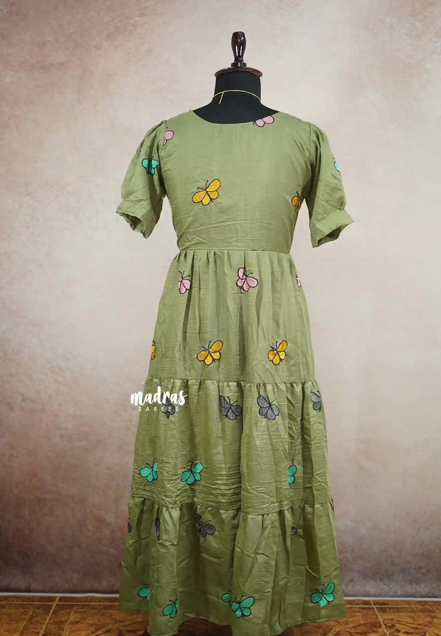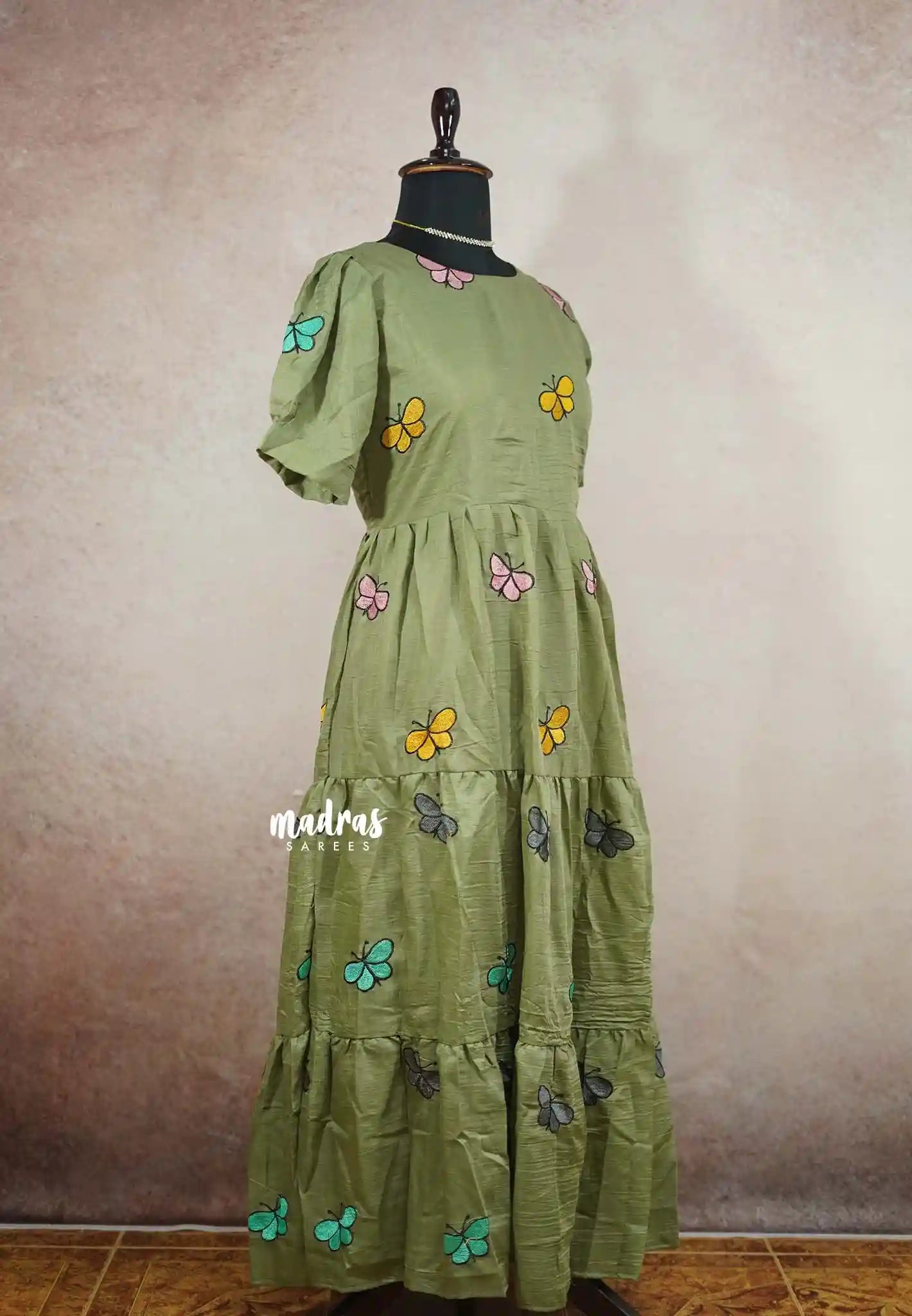 Maska cotton butterfly embroidery full length Frock / Dress - Olive green L SIZE