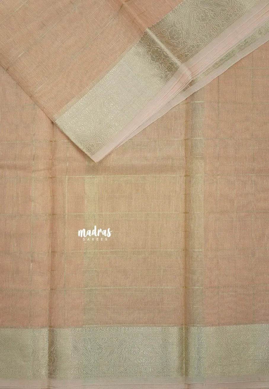 Banarasi Kota Tissue silk in pastel shades is a delicate fabric combining traditional weaving, lightweight Kota tissue, and jamdani weaving border. It’s ideal for light occasions, offering a soft, sophisticated look.