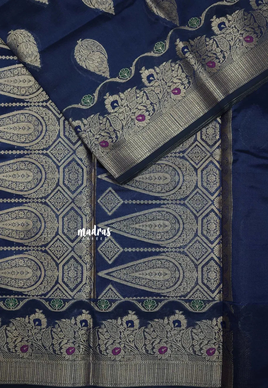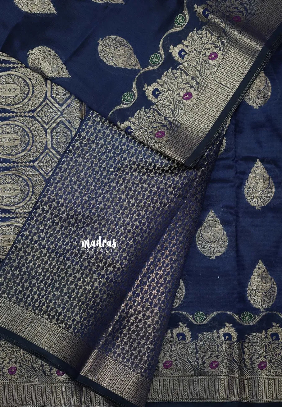 Midnight Blue - Durga - Banarasi Semi Dupion silk with Gold Zari Buttas and Border - Best for Function Wear