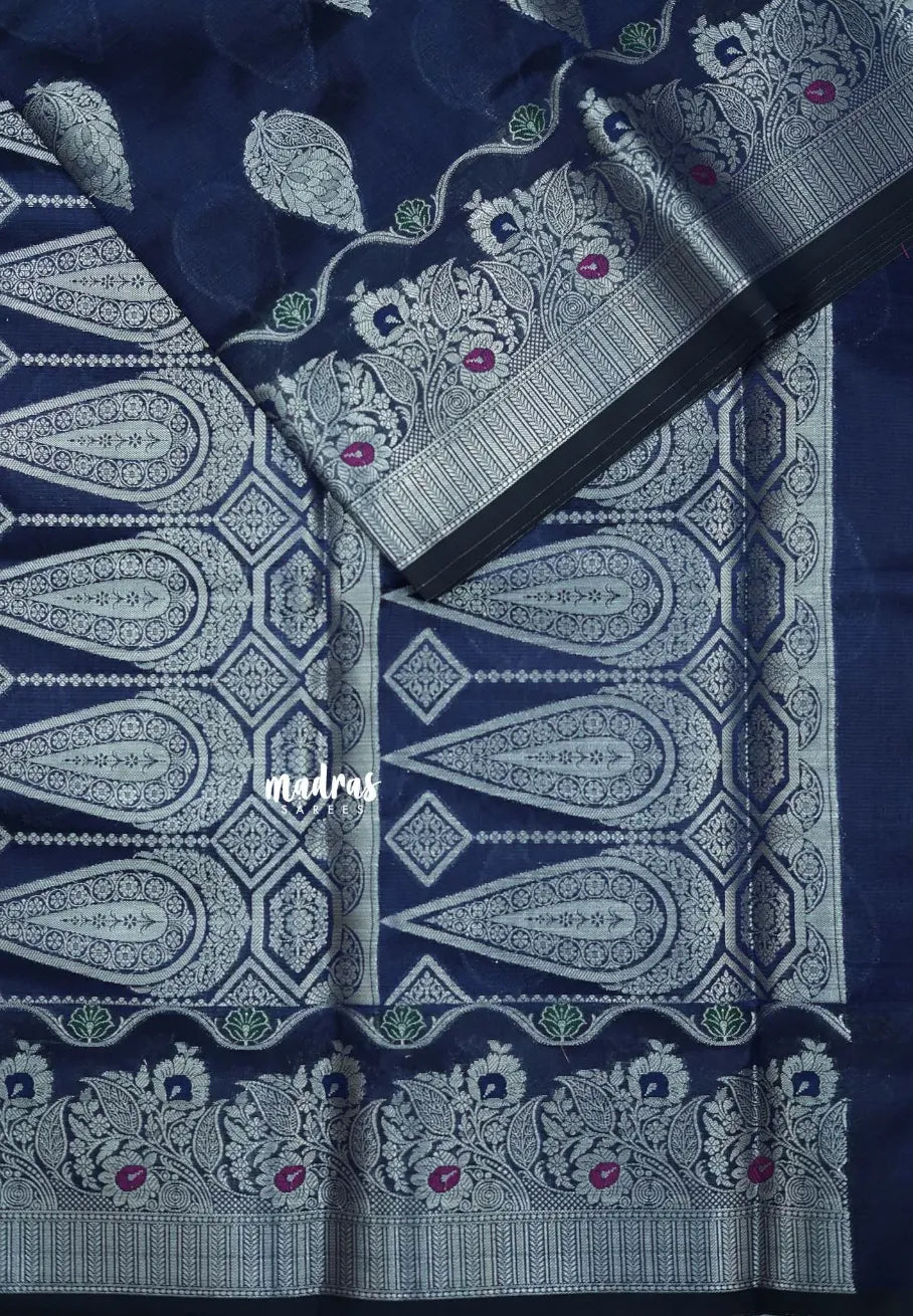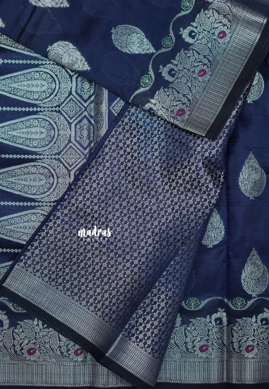 Midnight Blue - Durga - Banarasi Semi Dupion silk with Silver Zari Buttas and Border - Best for Function Wear
