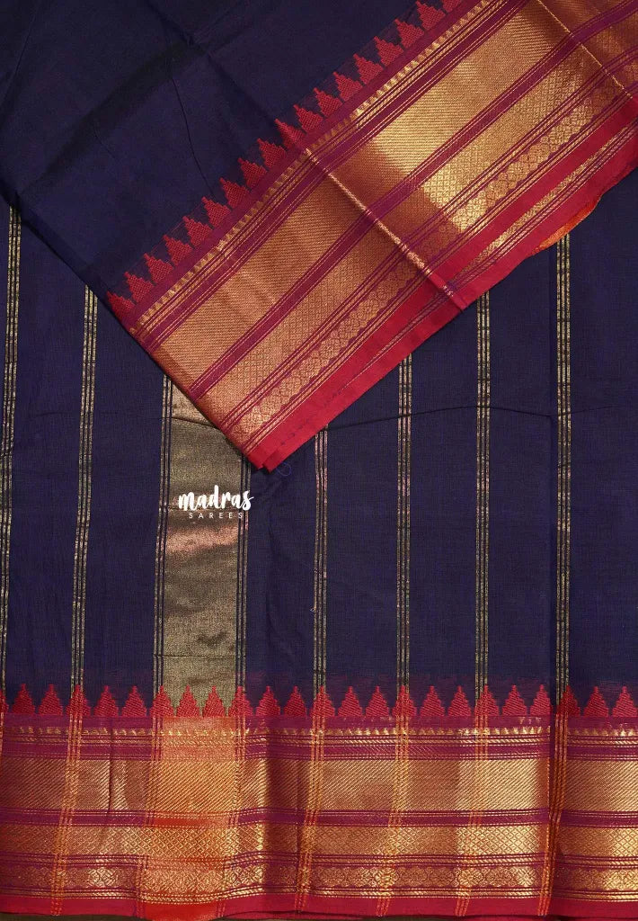 Midnight Blue - Karthigai Silk Cotton Bavanji with Temple Border - Best for Wedding Functions