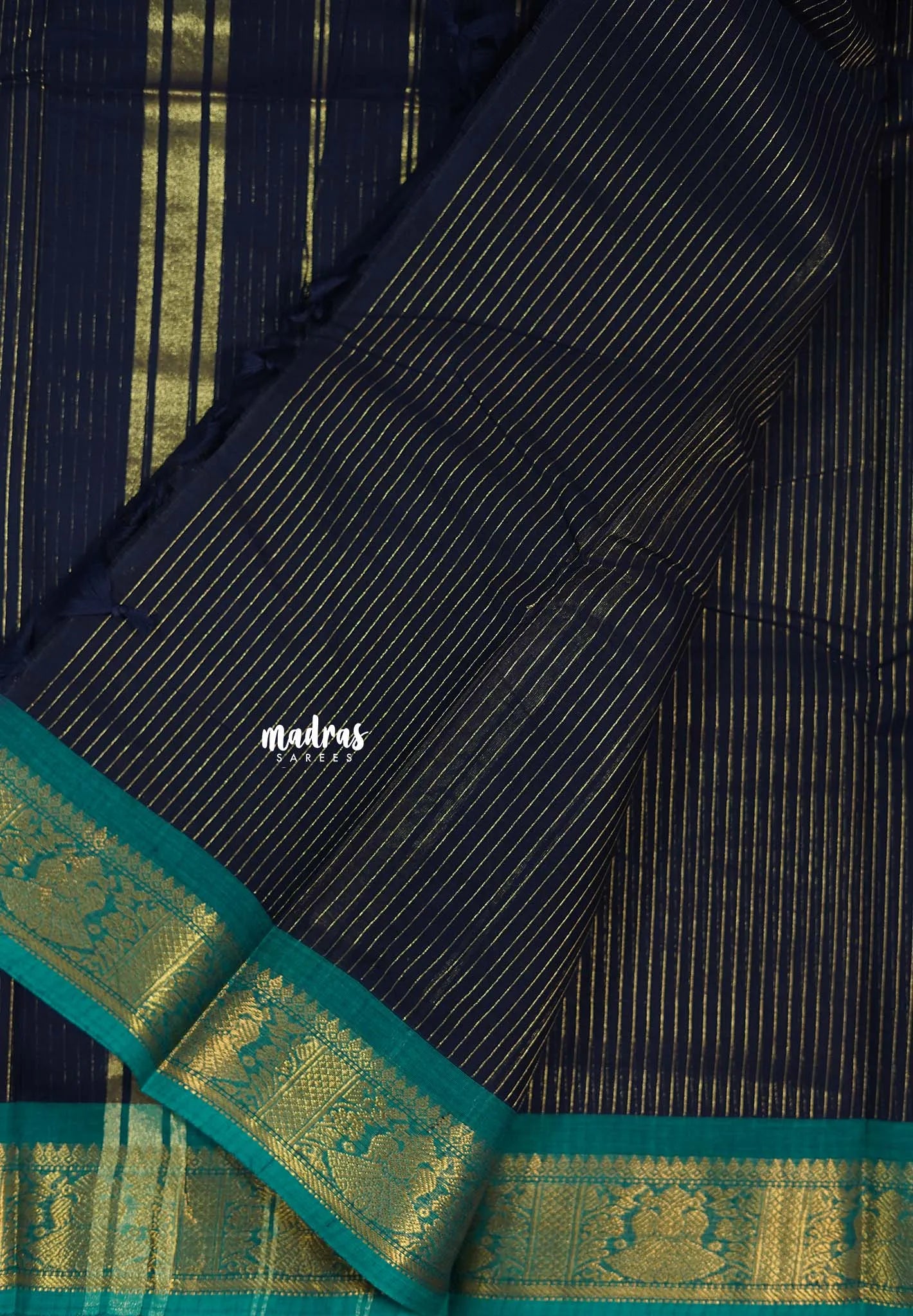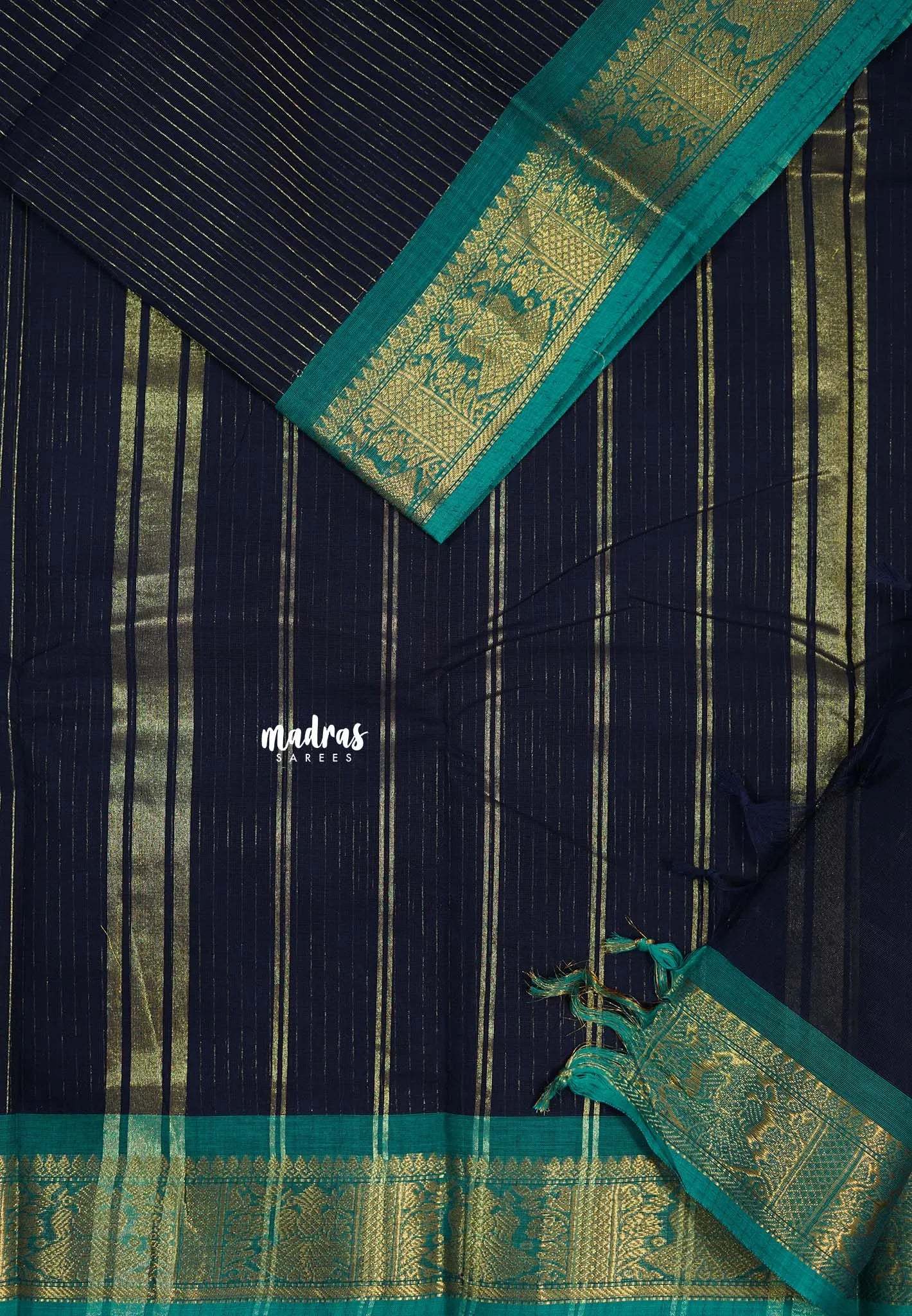 Midnight Blue - Karthigai Silk Cotton saree with Stripes Weaving - Best for Festive Wear