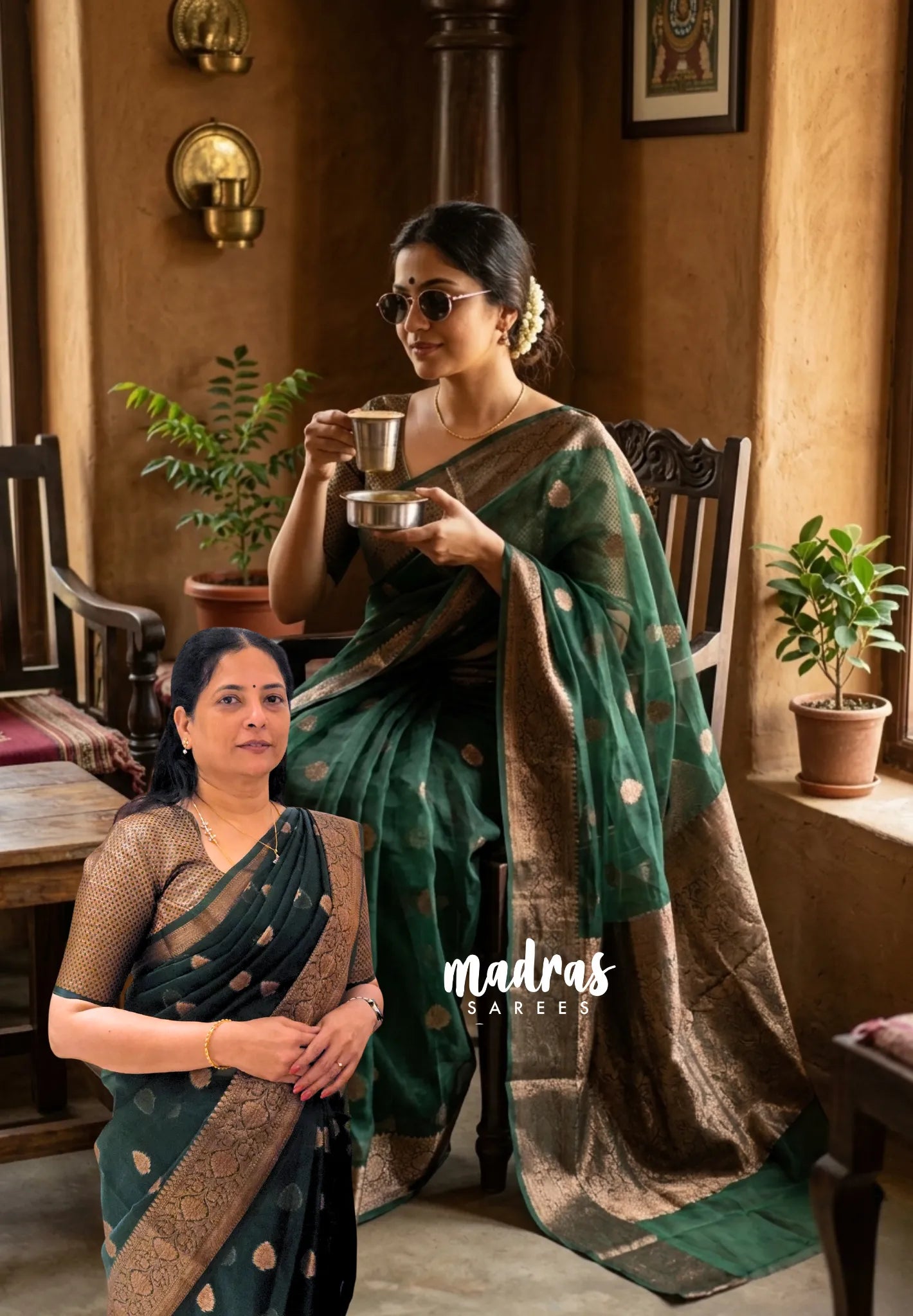 This elegant organza soft silk saree features delicate motifs zari woven throughout the body, complemented by sleek zari borders. Lightweight and graceful, it’s a timeless pick for festive occasions, weddings, or evening gatherings.