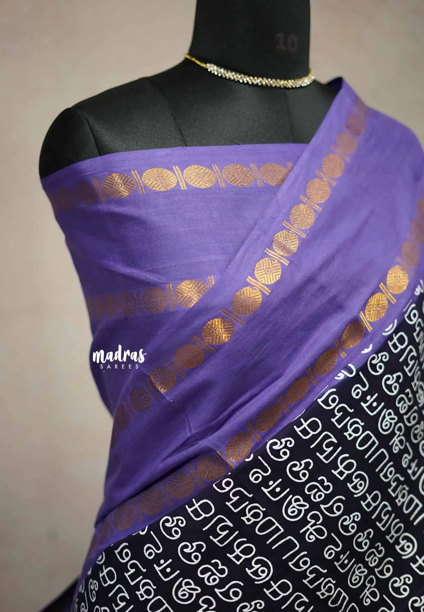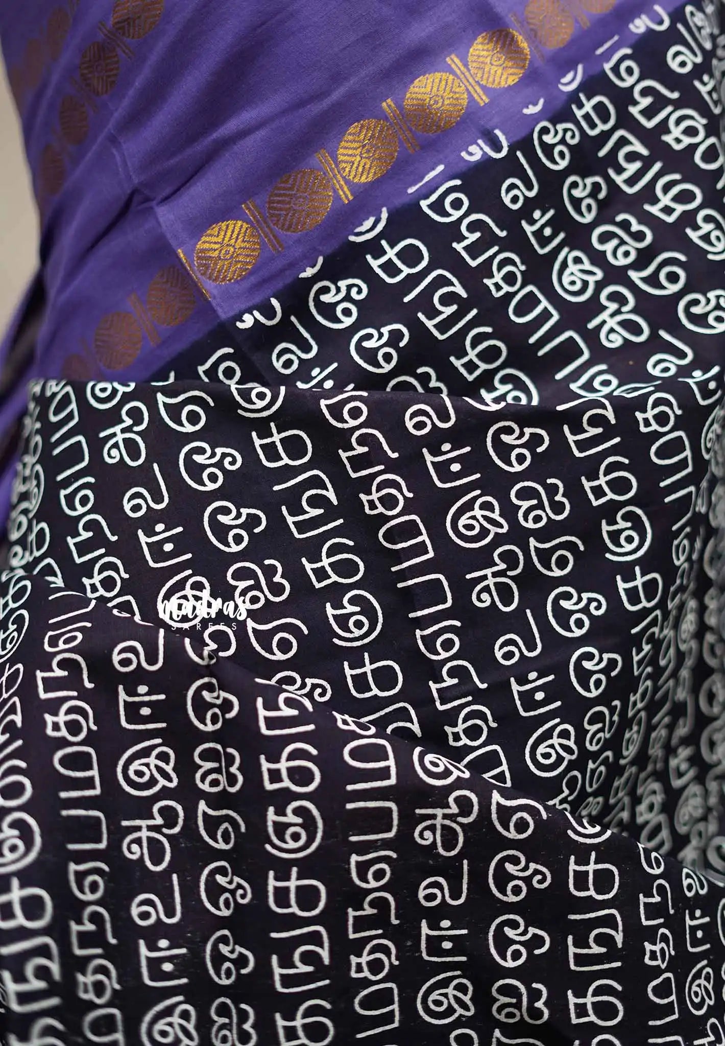 The Mozhi - Sungudi Cotton Saree with a Tamil Letters Rettapet Rudraksham Border beautifully blends tradition and comfort. Made from soft, breathable Sungudi cotton, it features Tamil letters printed across the body, honoring Tamil culture. The saree’s border, inspired by Rudraksha beads, adds elegance with symbolic motifs. Perfect for casual or festive occasions, it combines earthy tones and cultural significance for a stylish, meaningful look.