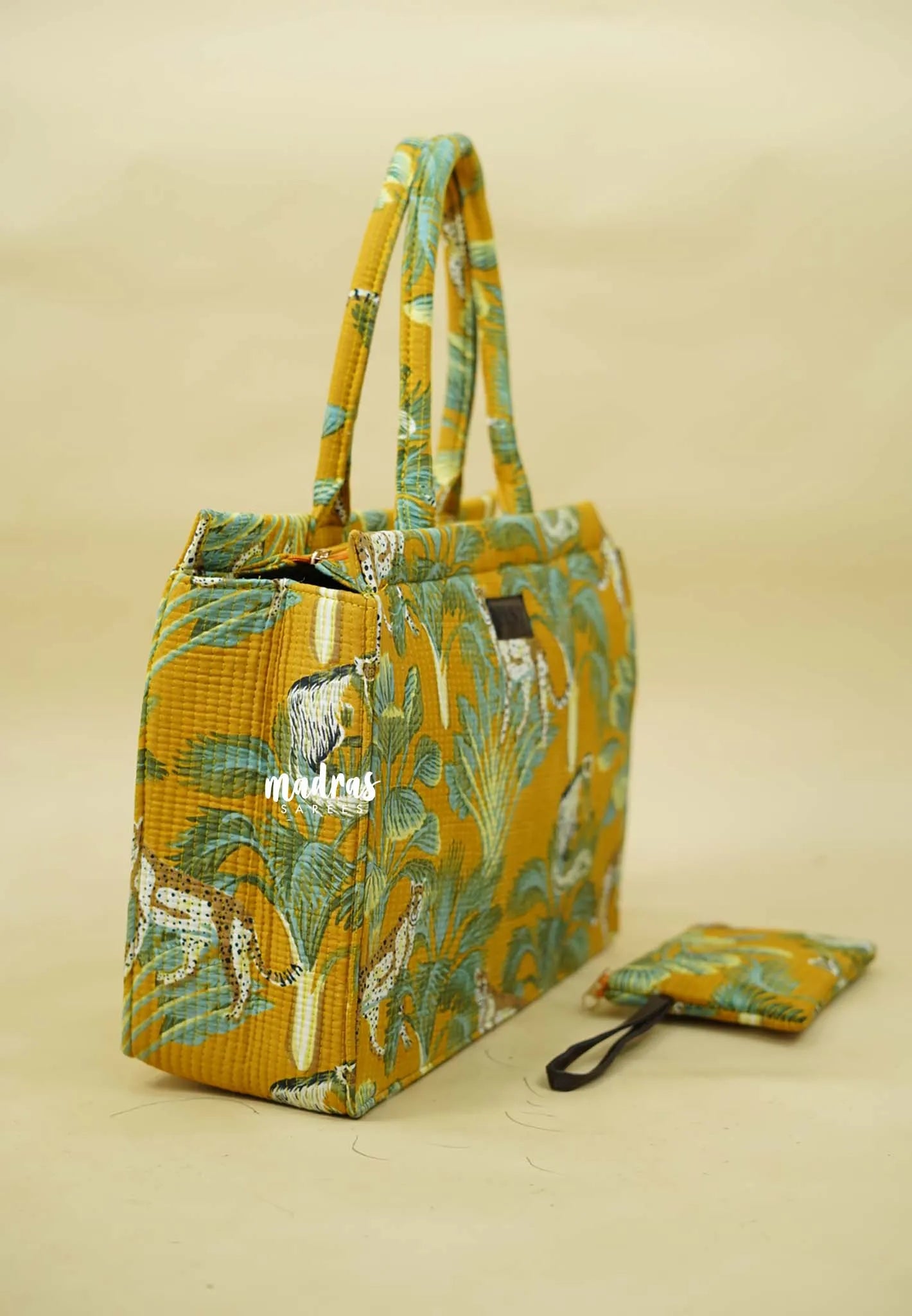 Hand wash separately in cold water with mild detergent, do not bleach, wring, or iron on print — dry in shade. Avoid soaking the bag in water to protect the fabric and design.