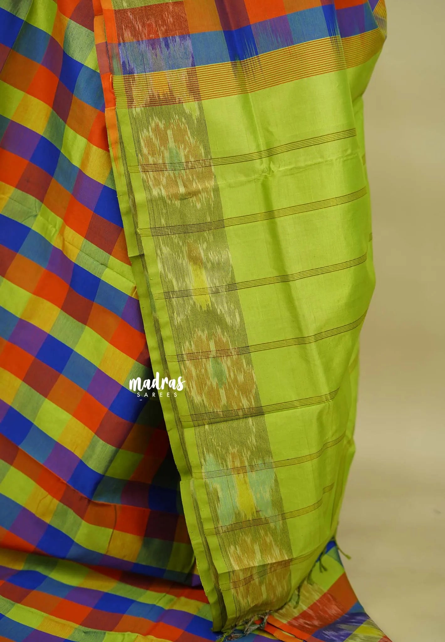 Multichecks Green pallu - Vaibhogam - Silk Cotton with Kattam Body with pochampalli border - Paalum Pazhamum - Best for functions