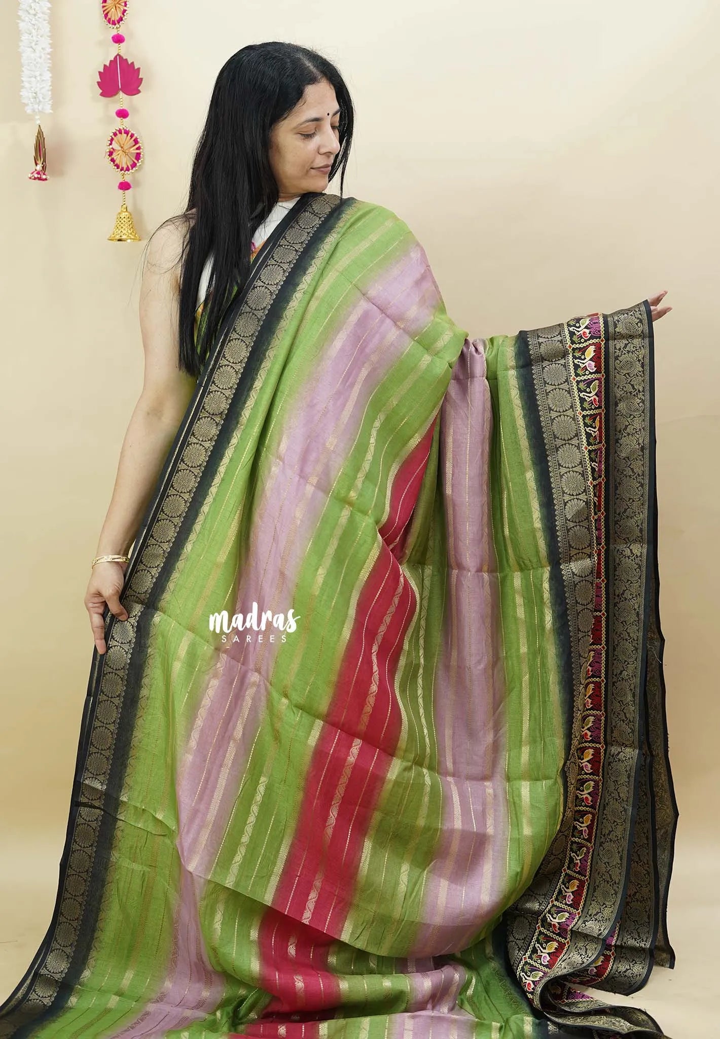 This Meenakari printed silk saree comes alive with its striking multi-color design, highlighted by zari borders and dotted patterns that enhance its festive charm. A perfect pick for occasions, it beautifully blends traditional artistry with vibrant elegance.