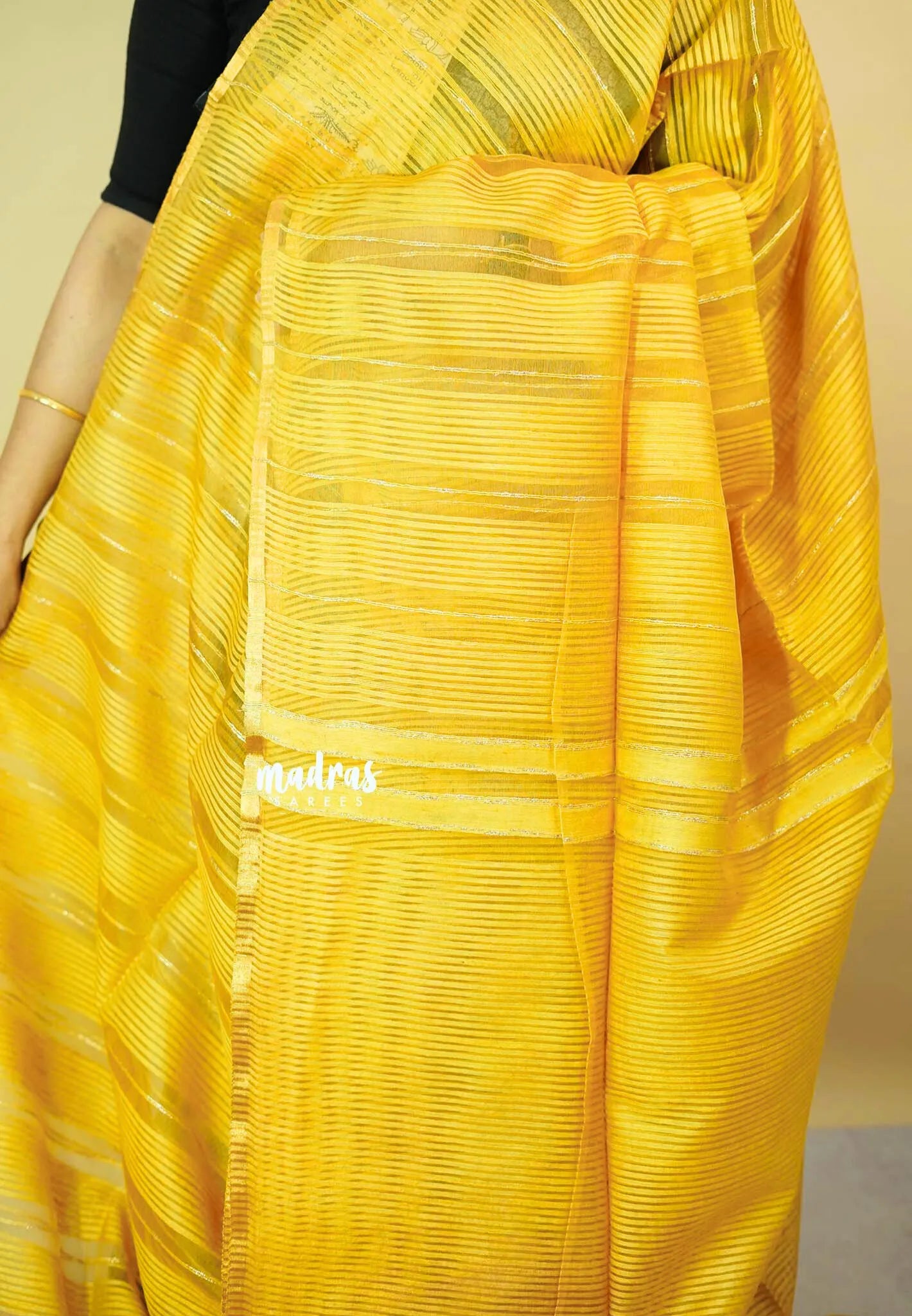 Mustard Yellow - Soft Organza silk with stripes weaving with small zari border