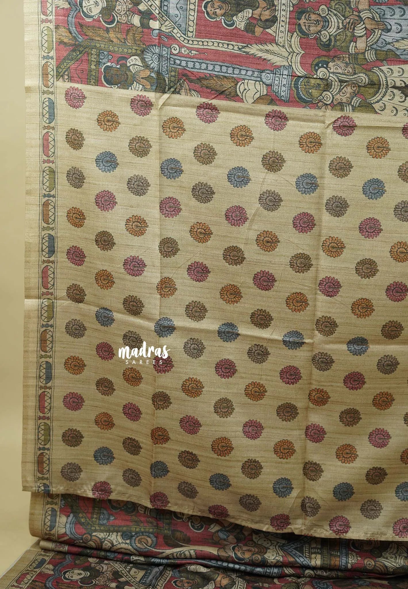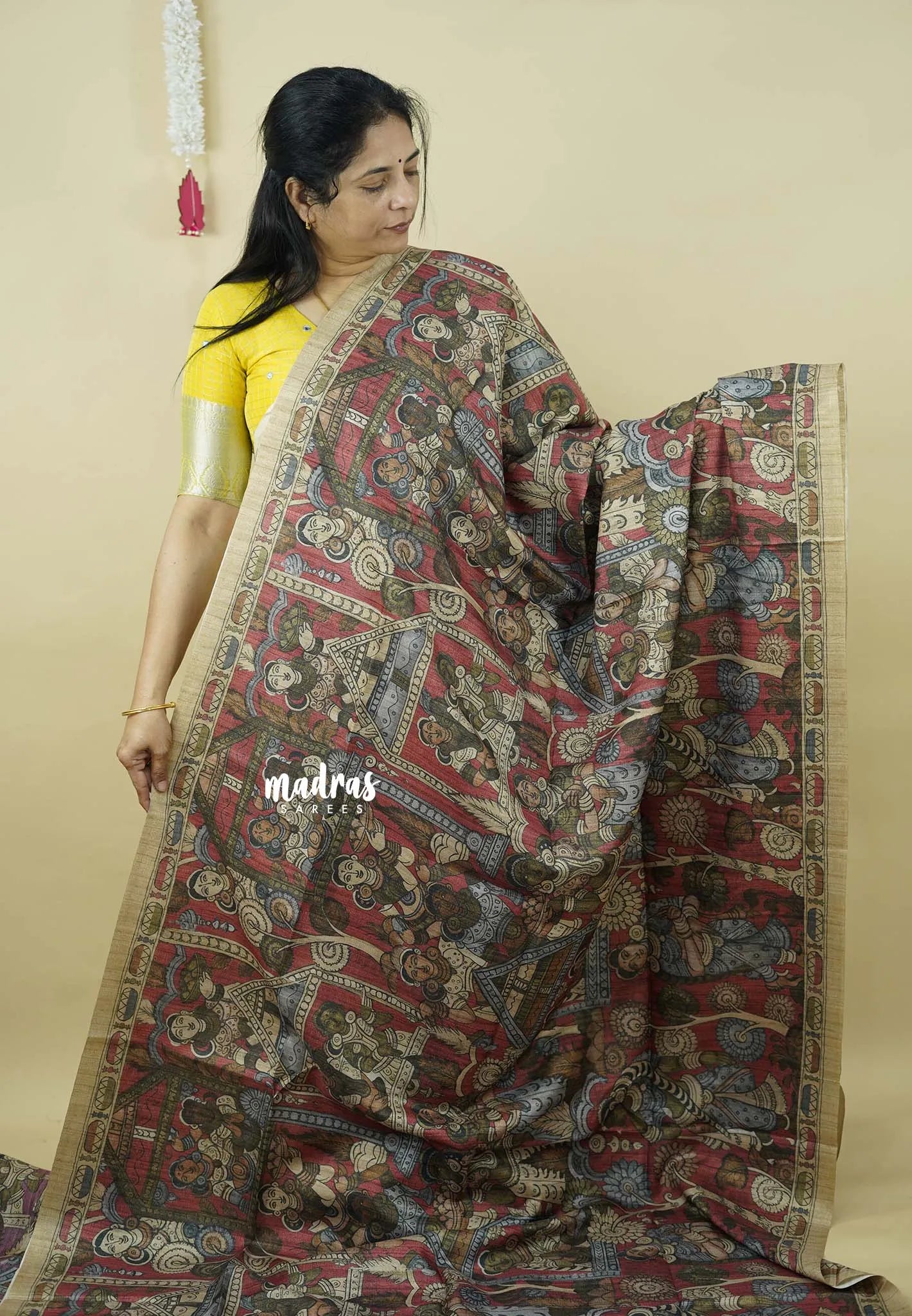 Muted Red - Roopa  - Premium Tussar Silk with Kalamkari Depiction