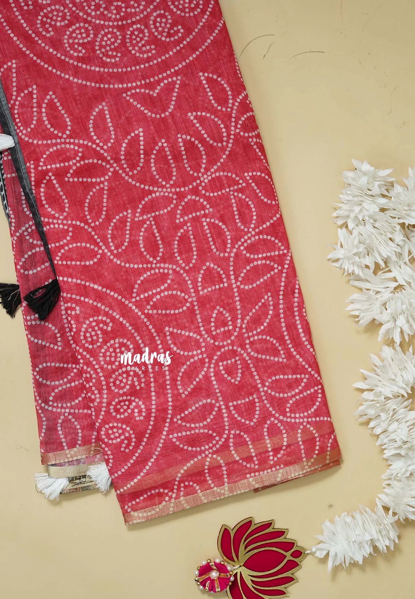 Muted Red - Soft linen cotton bhandani prints with ajrakh pallu and blouse with tiny border