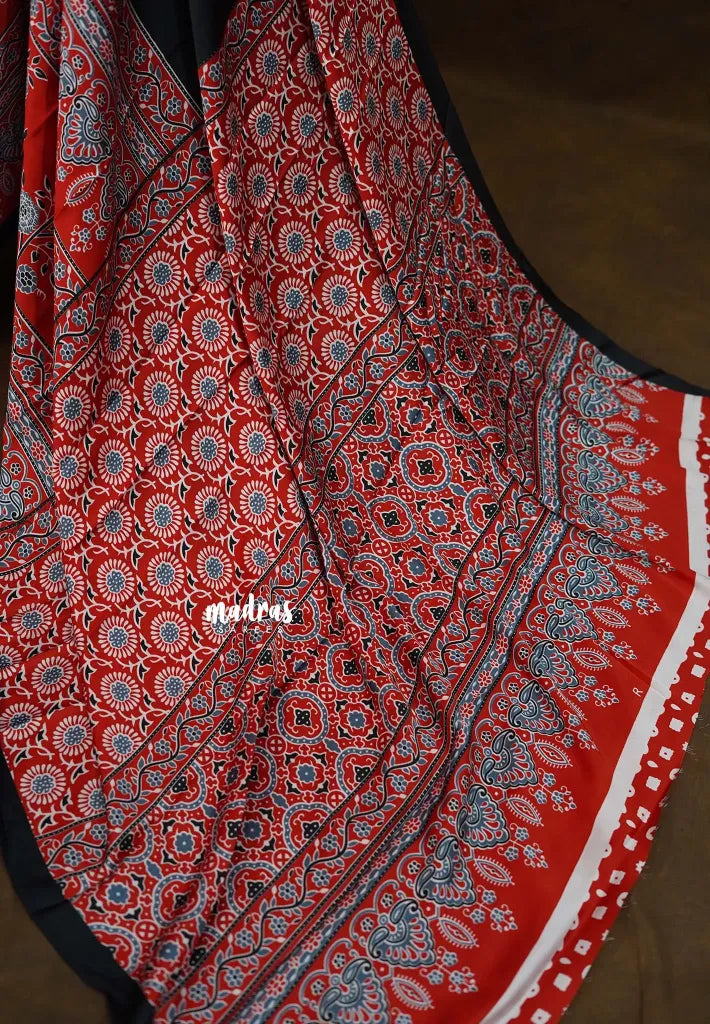 The modal silk saree fabric is buttery smooth and drapes really well on the body. Step into timeless tradition with this stunning Ajrakh Semi Modal Silk Saree featuring a classic half-and-half pattern. The rich combination of black and deep Ajrakh red creates a bold, elegant, and undeniably classy look.