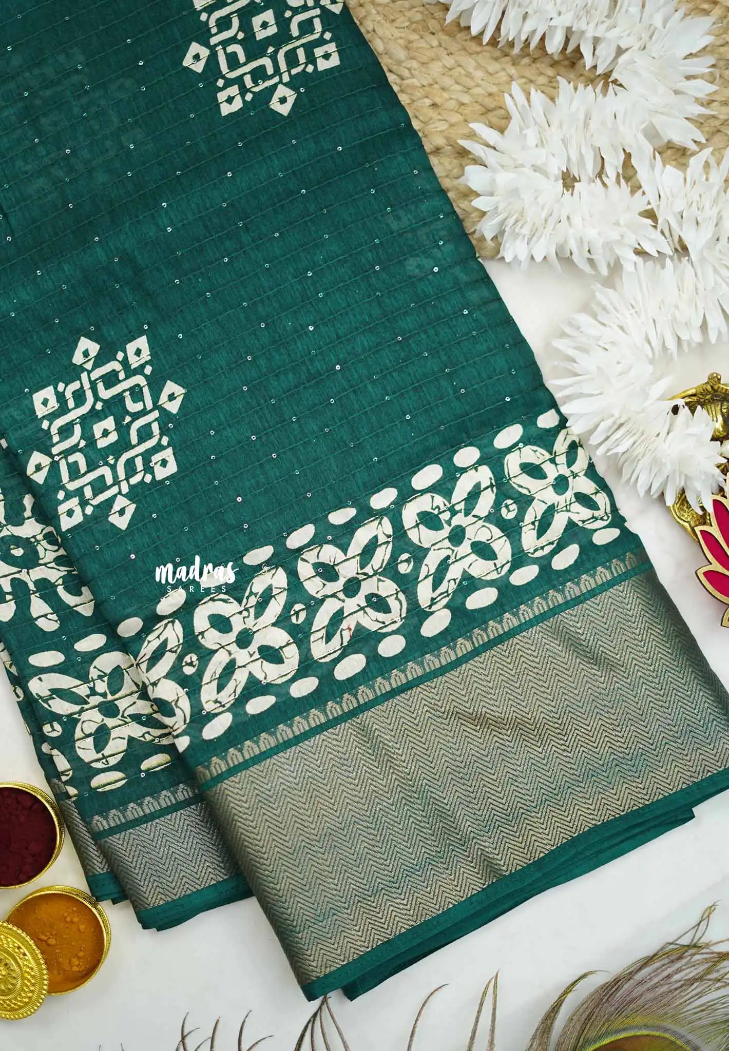 Super budget Nila printed silk with sequence all over the body. With its lightweight and smooth texture, this saree is perfect for daily use and gifting.