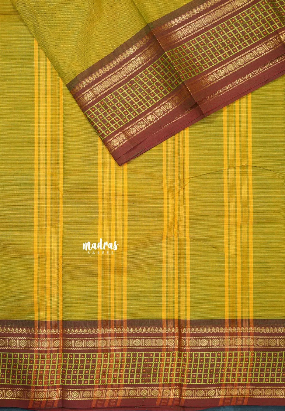 Dualshade Yellowish Green - Classic Kanchi cotton Saree Plain body with Rudraksham and checks Border - Best for Temple Visit